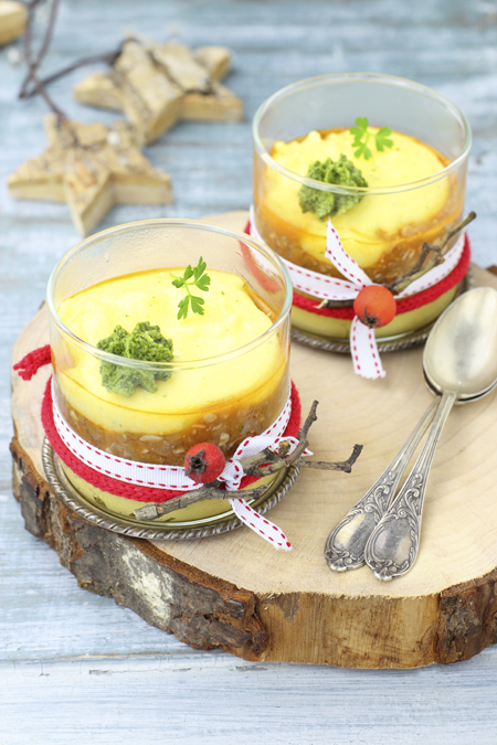 Comincerei con questi bicchieri con crema di mais, ragù di semi vegan e pesto alla salvia, che sono deliziosi, potete anche decidere di servire la polenta morbida al piatto, con al centro il ragù e il pesto di salvia, ma nel bicchiere fa più scena, diciamolo, la fa sembrare una ricetta impegnativa. E’ una piccola astuzia :) perché nei giorni di festa si sa, l’occhio vuole la sua parte più del solito.