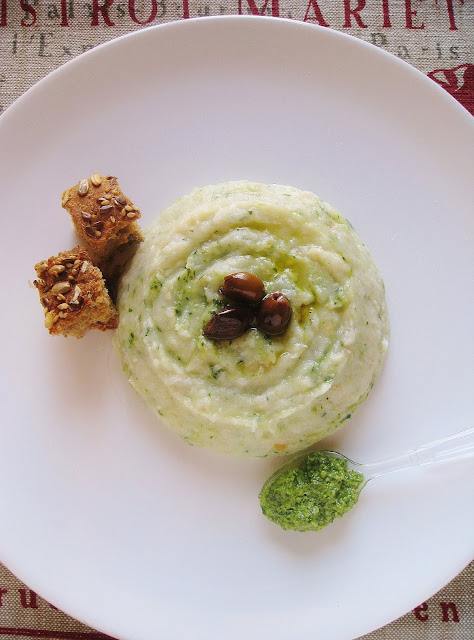 Qualche cucchiaino di pesto fatto in casa, le gustosissime olive taggiasche, un filo di olio extravergine di oliva rigorosamente della Riviera Ligure e la Brandade di Casa MG è servita.