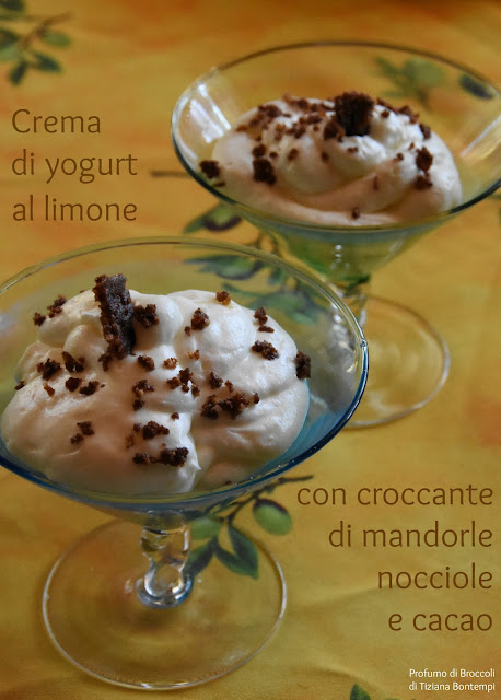 Per il croccante, vi ripropongo una ricetta che ha già avuto successo in famiglia e che ritrovate nel Calice di Cioccolato e nell’ultima Cheesecake fatta questo mese. Se volete arricchire ulteriormente il vostro dessert, potete mettere degli spicchi di mela freschi o caramellati sopra la crema, oppure dell’altra frutta di stagione, dato che il limone si sposa bene con tutto.