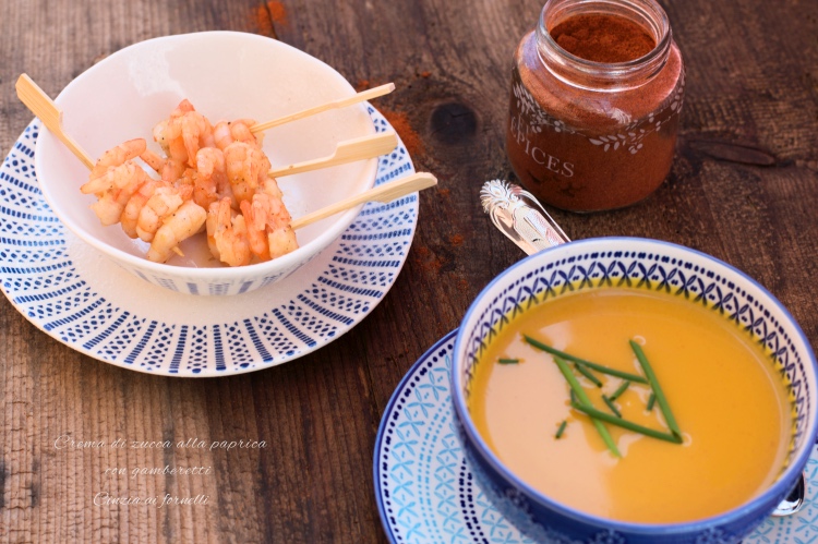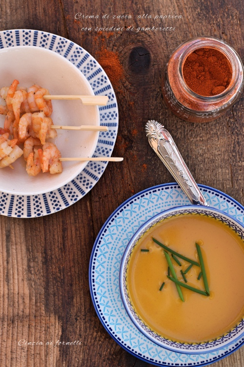 A volte non occorrono grandi cose per essere felici.. Bastano poche cose, fatte di semplicità proprio come questa deliziosa crema di zucca con paprica dolce. Un piatto dal profumo avvolgente, dal sapore delicato che ben si sposa con deliziosi gamberetti freschi, cotti in un mix di rum, curry, limone, pepe e sale.