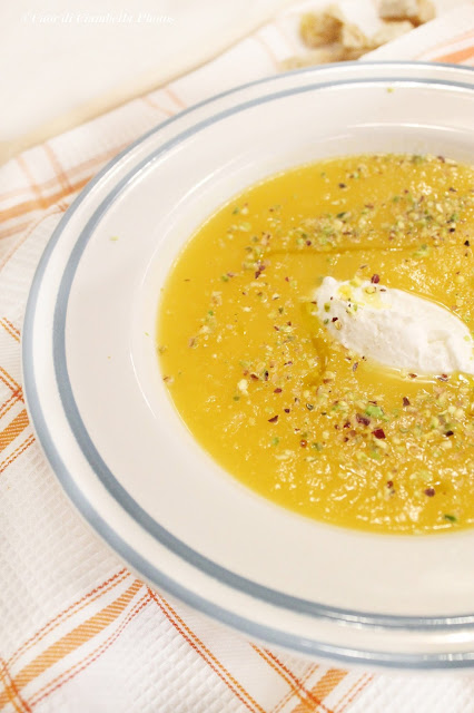 Una volta impiattata la crema, aggiungi un cucchiaio di formaggio cremoso ( o se devi servirla a degli ospiti una quenelle fa più figo :-)) a temperatura ambiente, pistacchi tostati e un filo di olio evo. Servi la crema con crostini fatti tostando in forno dei cubetti di pane integrale con un filo di olio e un pizzico di sale. Salutare, gustoso e davvero confortate!! Provare per credere!!!