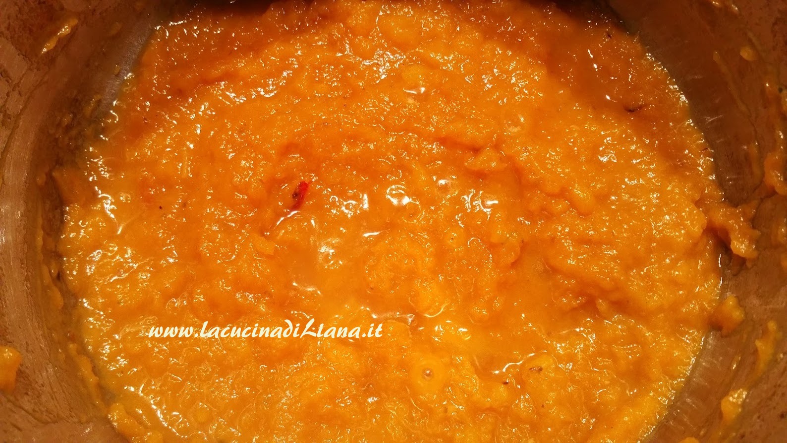 Rosolare l’aglio e il peperoncino tritati in poco olio, quindi aggiungere a rosolare i dadini di zucca, bagnare con il brodo, chiudere la pentola, impostare la potenza a 1, e il timer per 6 minuti.
