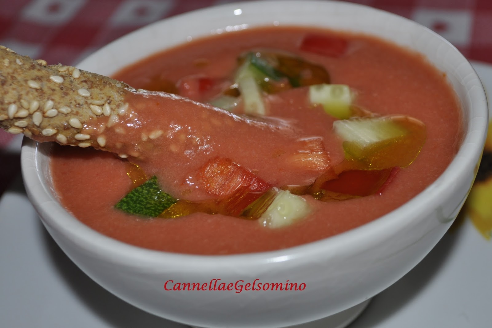Ingredienti (per 4 persone): 400 g di datterini, 1 peperone rosso, 1 cetriolo, olio extravergine d’oliva, 1 cipolla piccola, sale, aceto, mollica di pane.