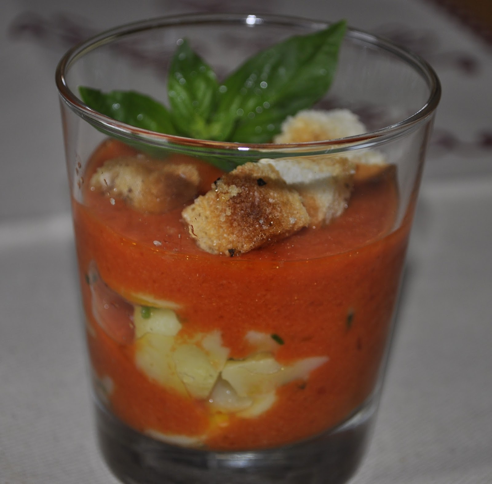 Sistemate le patate sul dondo di bicchieri o ciotoline, versate la crema di peperoni e completate con crostini tostati in forno e foglie di basilico. Buon appetito!