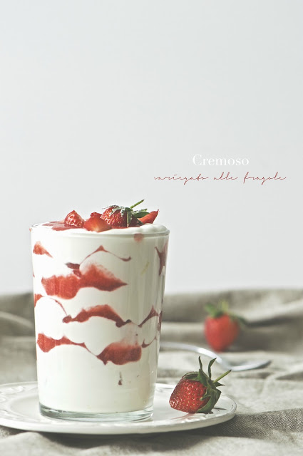 Una fantastica coppa a strati, composta da una crema di formaggio aromatizzata al limone con delle fragole a pezzi e ridotte in purea, per rendere la merenda super golosa.