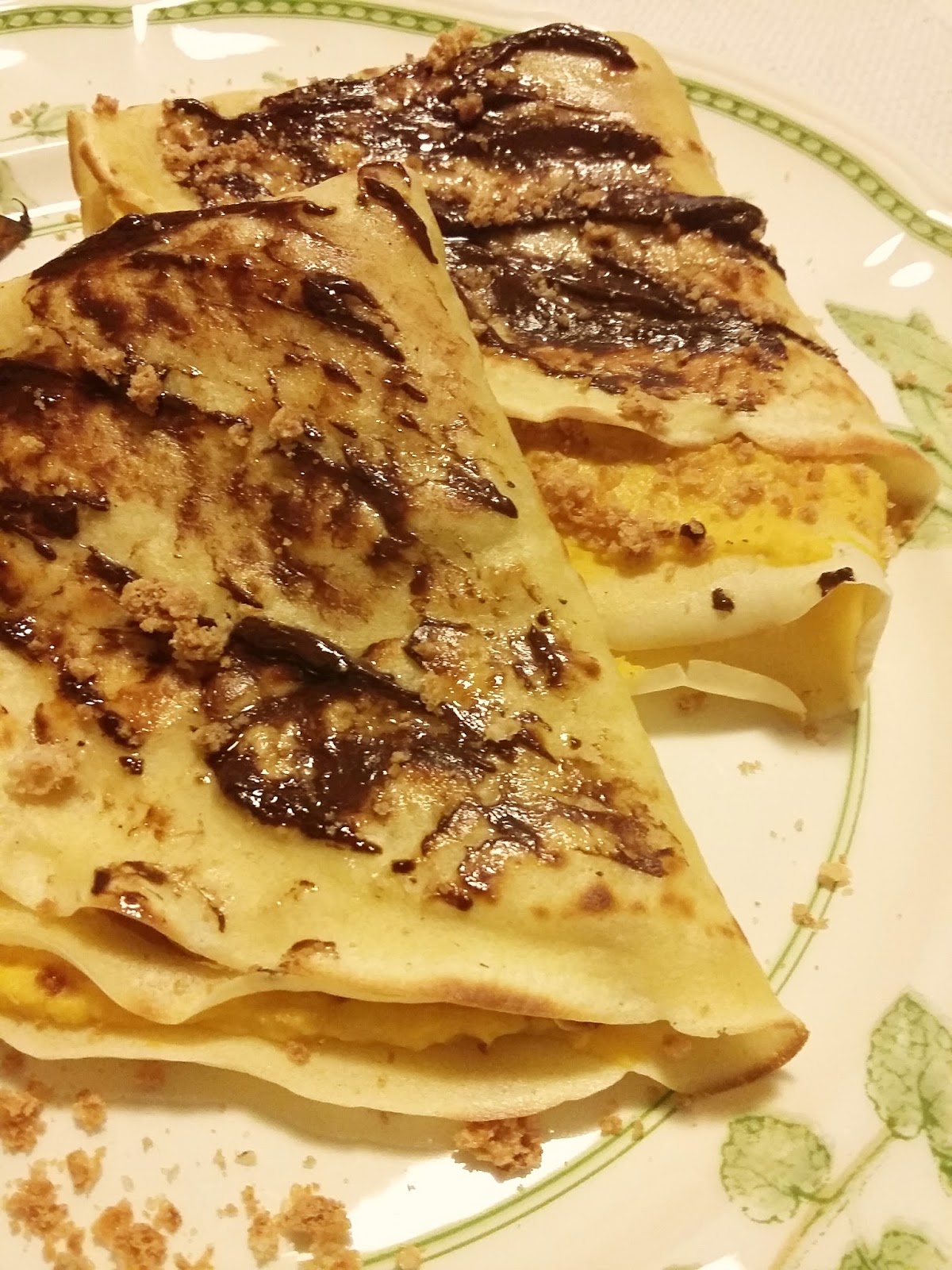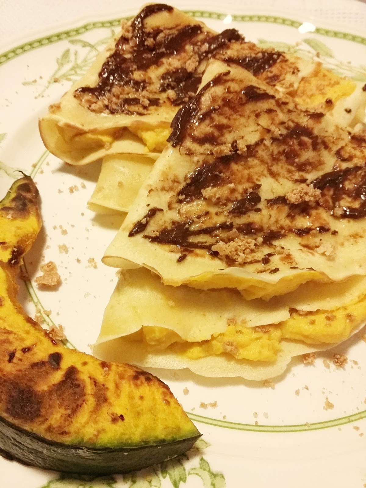 Cotte tutte e 12 le crêpes, il più è fatto. Copritene un lato di ciascuna con la crema di zucca, senza esagerare: ne basta poca, o non sentirete più il sapore della crêpe! Sbriciolatevi sopra uno o due amaretti quindi chiudete prima a metà, come una piadina, e poi ancora a metà.