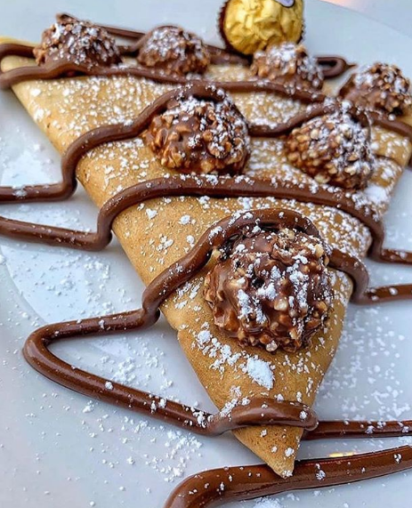 Preparate le crépes con l’uovo, il latte, la farina e la buccia del limone grattugiata. Versate un mestolo alla volta del composto ottenuto in una padella antiaderente precedentemente imburrata. Dopo qualche minuto girate dall’altro lato. Farcite le crépes con la nutella e aggiungetevi sopra dei ferrero roches e buon appetito.
