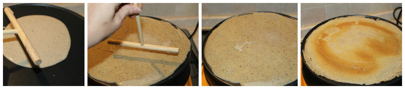Scaldate una padella antiaderente grande oppure accendete la piastra elettrica per le crepes, versate un mestolo d’impasto sulla piastra e con una spatola o l’apposito attrezzo allargate la pastella.