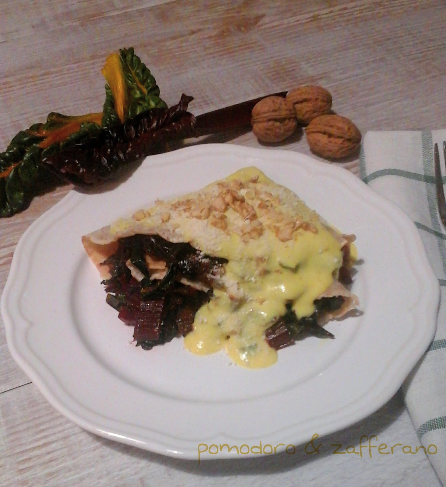 Pulite, lavate le bietole e tagliatele a striscioline sottili. Scaldate una padella e fate rosolare il porro in un cucchiaio di olio, unite le bietole, salate pepate e portate a cottura.