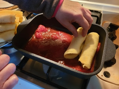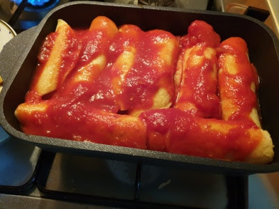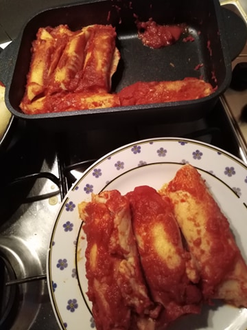 Riempitele con il composto di ricotta e mozzarella, arrotolatele e disponetele nella rostiera ricoperta di una base di sugo.