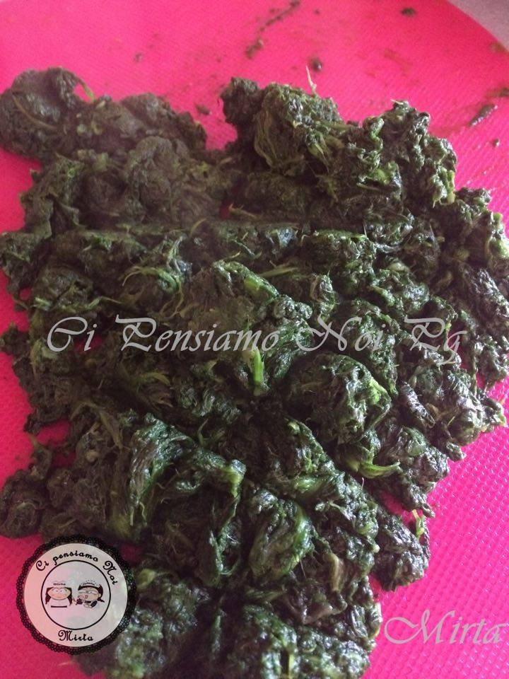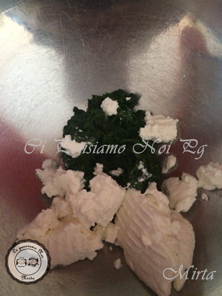 Intanto in una casseruola faccio bollire dell’acqua e ci tuffo gli spinaci( Io mi scuso per gli spinaci congelati, ma quando sono andata a far spesa non c’erano più ma volevo far assolutamente questa ricetta!!! PERDONO! PERDONO! PERDONO!)Una volta che gli spinaci si sono cotti, li ho fatti scolare molto bene e una volta intiepiditi li ho strizzati bene, non deve rimanere dell’acqua. Successivamente li ho tagliati a coltello e amalgamati alla ricotta, insaporita con parmigiano, sale, pepe, e un pochino di noce moscata.