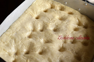 Riprendere l’impasto dare due pieghe e poi stenderlo in una teglia unta d’olio ( con questa dose la teglia è di 32cm x23cm, così da ottenere uno strato alto circa 1 cm).