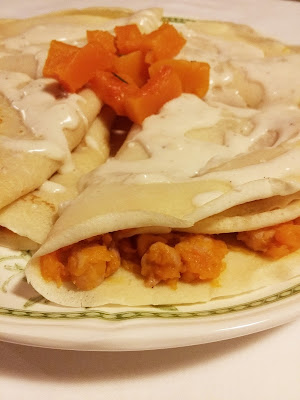 Ieri ho fatto la crema pasticcera per un dolce. Quattro tuorli e tutto in proporzione, il che implica quattro albumi da smaltire. Se avanzano i tuorli, mal che vada i miei mici apprezzano… ma gli albumi? Invece delle solite meringhe ho fatto le crespelle che seguono: facilissime e pratiche ma molto saporite grazie all’incontro tra zucca e pancetta! Credevo che 10 (doppia dose) fossero tante ma… sono andate finite in un lampo!