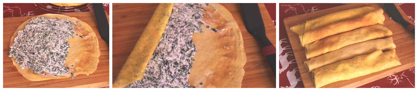 Dividete questo composto su ogni crepes spalmandola per circa due terzi della sfoglia, arrotolatele su se stesse.