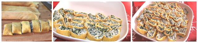 Tagliate ogni rotolino in in circa 6 o 8 rondelle disponetele man mano in una pirofila da forno.