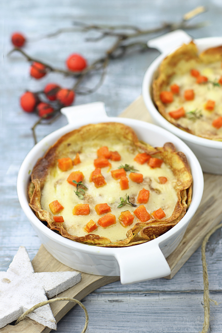 Premetto per onestà che questo non è un piatto velocissimo, richiede un pò di impegno, questo si, ma non troppo, ed ha il vantaggio di poter essere preparato in anticipo e semplicemente infornato all’ultimo momento. Avendolo pensato in monoporzione poi è ancora più semplice, basta toglierlo dal forno e servirlo in tavola senza nemmeno doversi preoccupare di tagliare delle fette perfette :) E’ un piatto goloso, di stagione. Secondo me un primo piatto molto carino per Capodanno. Fa parte del menù che ho preparato l’anno scorso perla LAV, ma che non avevo ancora mai postato, ma non poteva mancare tra queste pagine dato che aveva riscosso un certo successo :) Non riesco a pubblicarlo tutto per mancanza di tempo, ma trovate il menù completo scaricabile nella homepage di questo blog, proprio li alla vostra destra. Domani per augurarvi buona fine e buon inizio vi lascerò l’ultima proposta, facilissima, veloce e molto sfiziosa, ma per ora non anticipo nulla. L’appuntamento per tutti i ritardatari è per domani sempre qui. Vi dico solo procuratevi del cavolo riccio abbondante ecco, solo questa piccola anticipazione. Ora vi lascio alla ricetta di oggi così se volete potete portarvi avanti con il lavoro preparando qualcosa in anticipo. E se cercate qualcosa da aggiungere come secondo piatto, vi lascio anche questa proposta