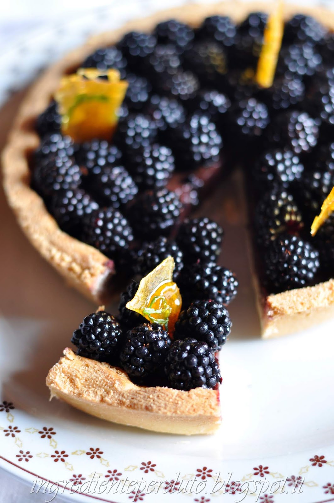 Decoriamo la torta con le more disponendole in modo ravvicinato sino a coprire tutta la superficie, rompiamo il croccante e decoriamo.