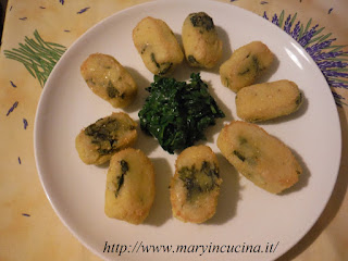 Lessare le patate con la buccia coperte d’acqua per 40 minuti, provare a bucherellarle con la forchetta per controllare la cottura. Sbucciarle e passarle allo schiacciapatate. Nel frattempo cuocere le cime di rapa al vapore o lessarle. Tagliarle un po’ ed unirle alle patate assieme la formaggio di riso tagliato a cubetti. Mescolare bene, aggiungere un pizzico di sale. Ottenere delle crocchette con le mani e passarle nella farina di mais, adagiarle su una teglia con cartaforno, inumidire i crocchè con un filo d’olio ed infornare a 190° per 30 minuti. Si accompagnano bene con altre cime di rapa ripassate in padella con olio aglio e peperoncino.