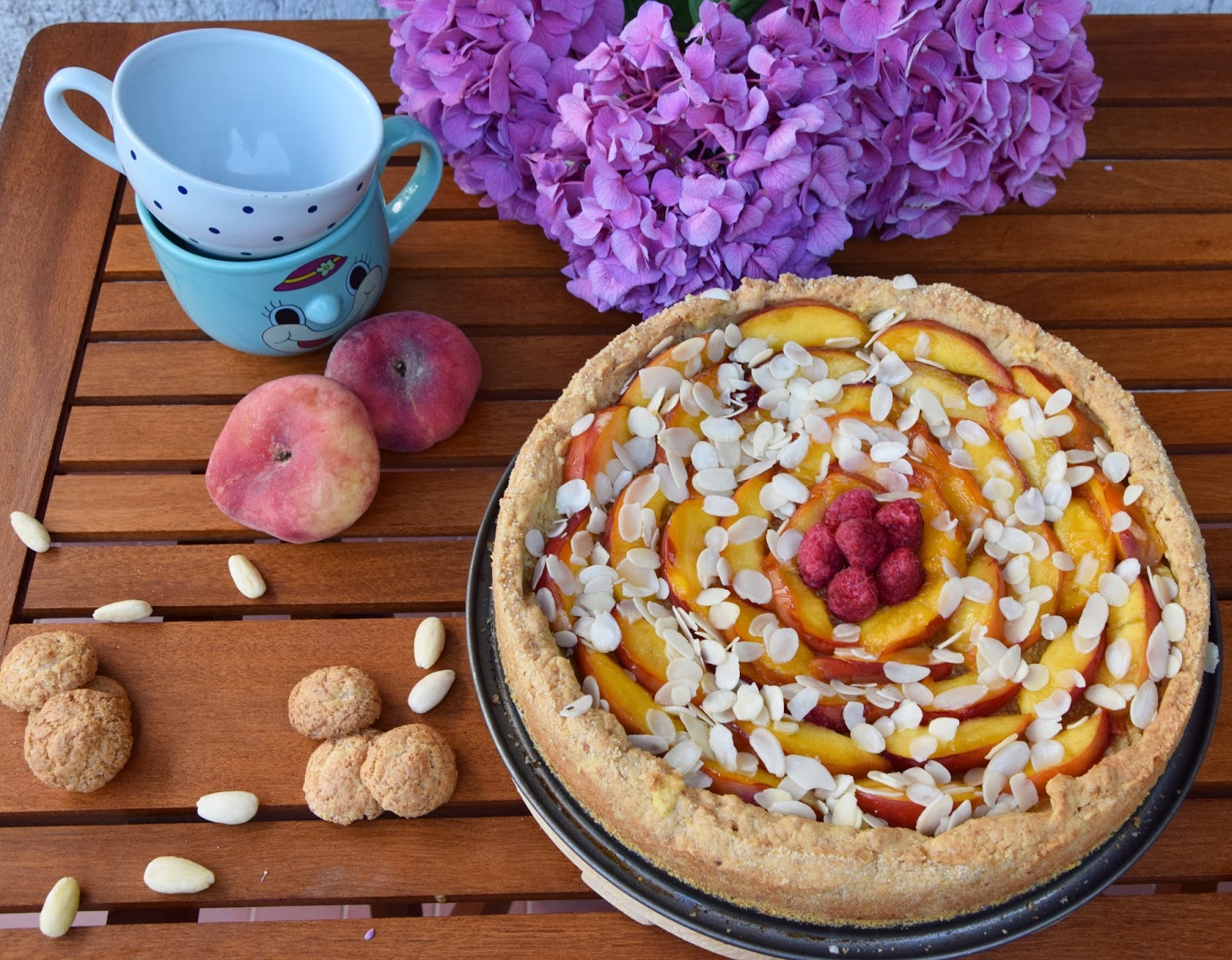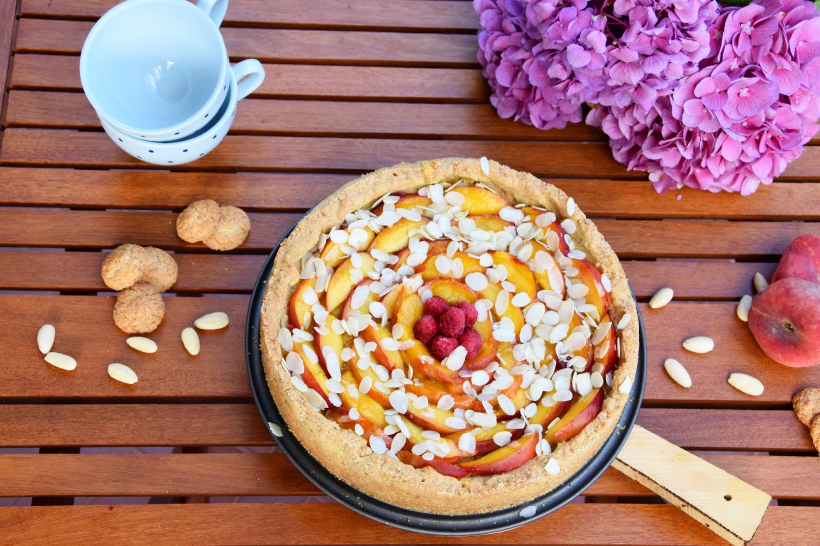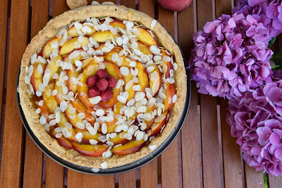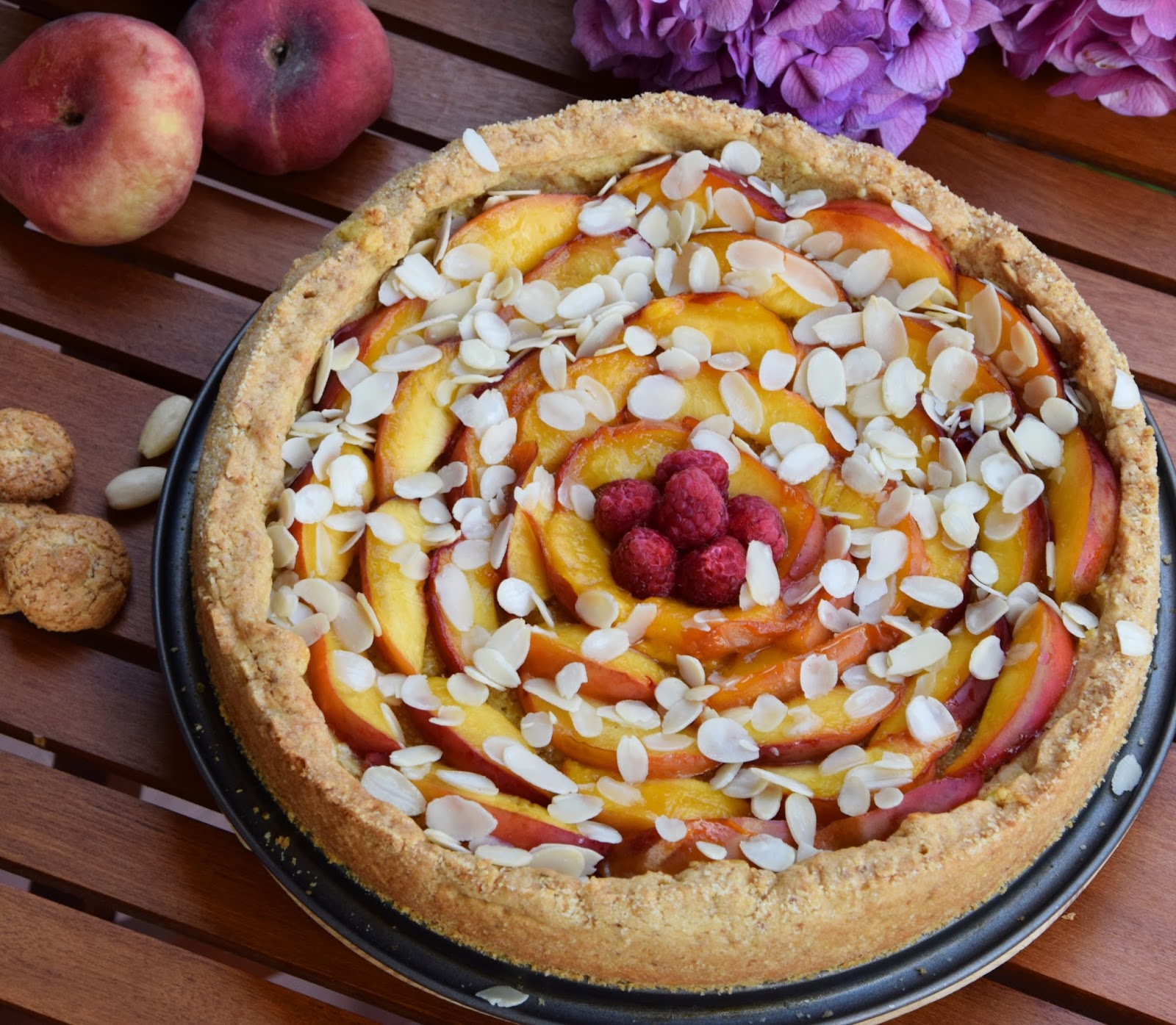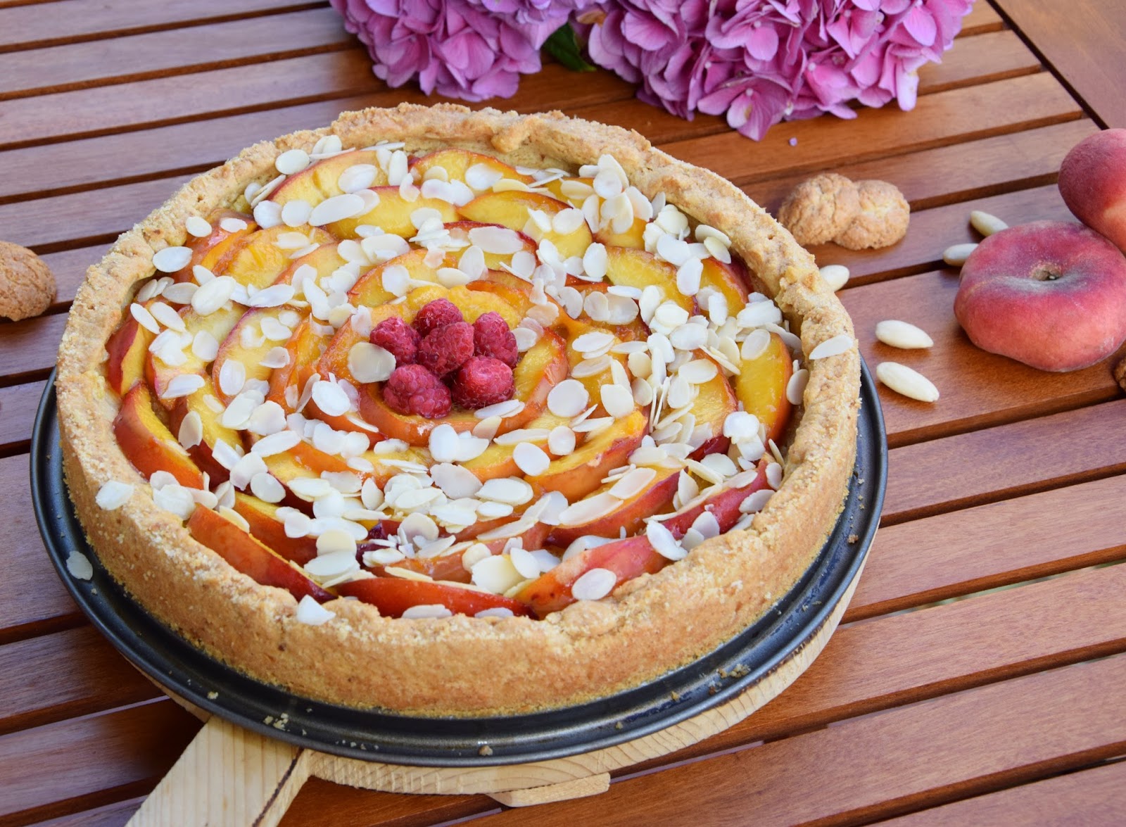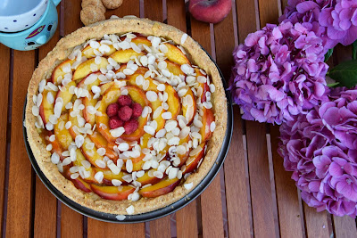 Proprio in questa occasione e per recuperare i festeggiamenti del compleanno della mia zia preferita, ne ho approfittato per preparare questa crostata estiva in cui la dolcezza e la croccantezza dell’amaretto accolgono in un friabile guscio di pasta frolla una golosa crema frangipane alle mandorle ricoperta da succose e colorate pesche noci caramellate.