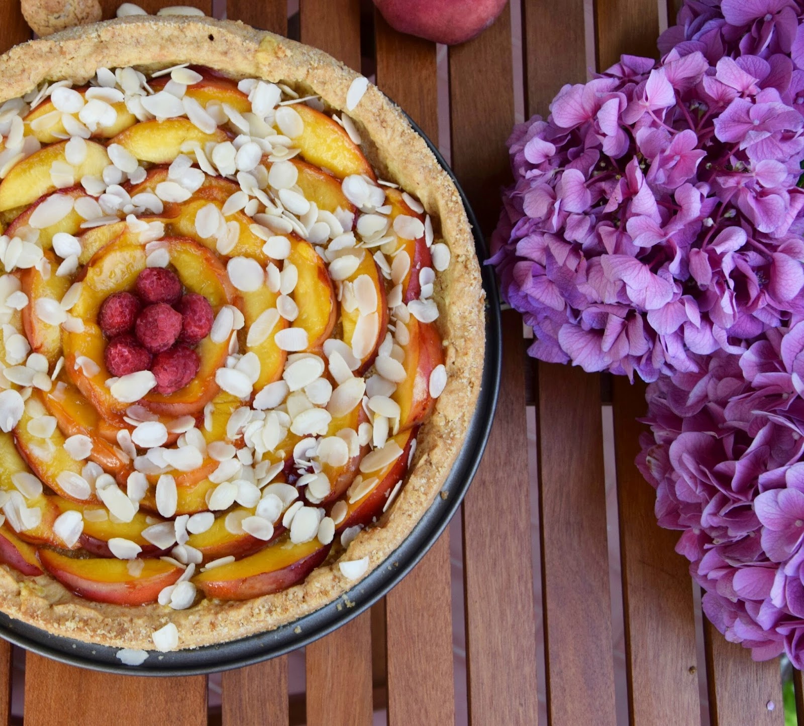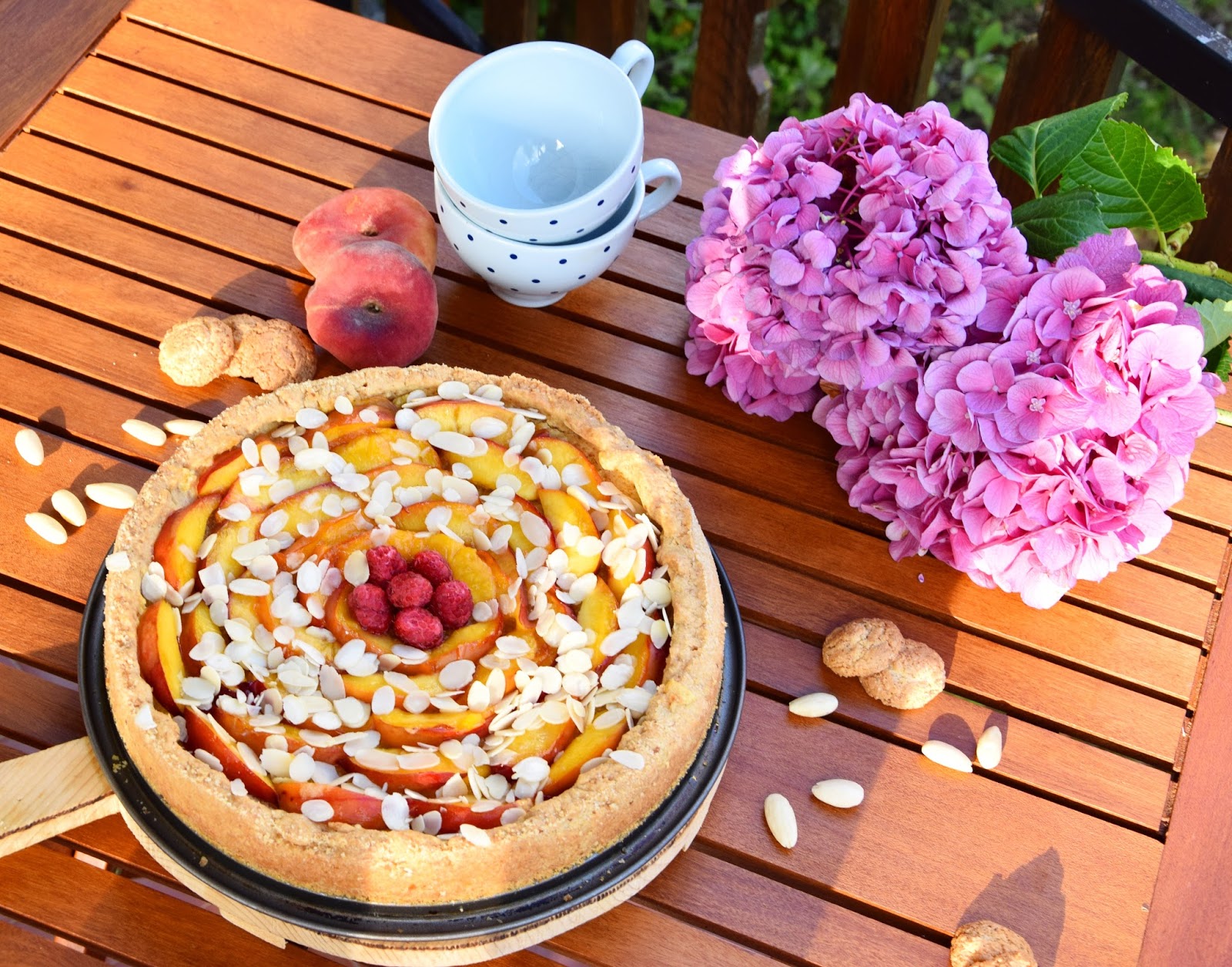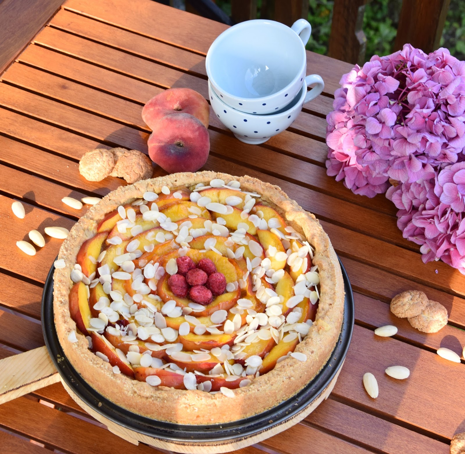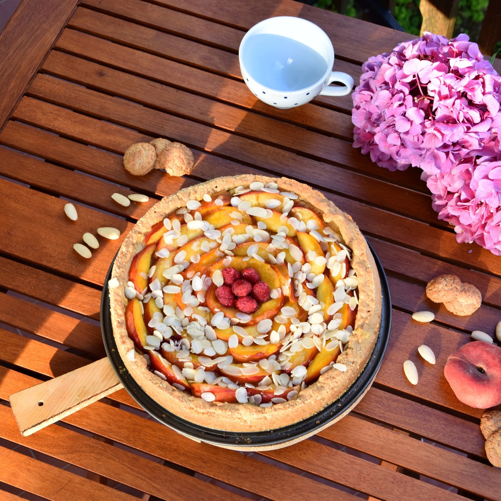 Proprio in questa occasione e per recuperare i festeggiamenti del compleanno della mia zia preferita, ne ho approfittato per preparare questa crostata estiva in cui la dolcezza e la croccantezza dell’amaretto accolgono in un friabile guscio di pasta frolla una golosa crema frangipane alle mandorle ricoperta da succose e colorate pesche noci caramellate.