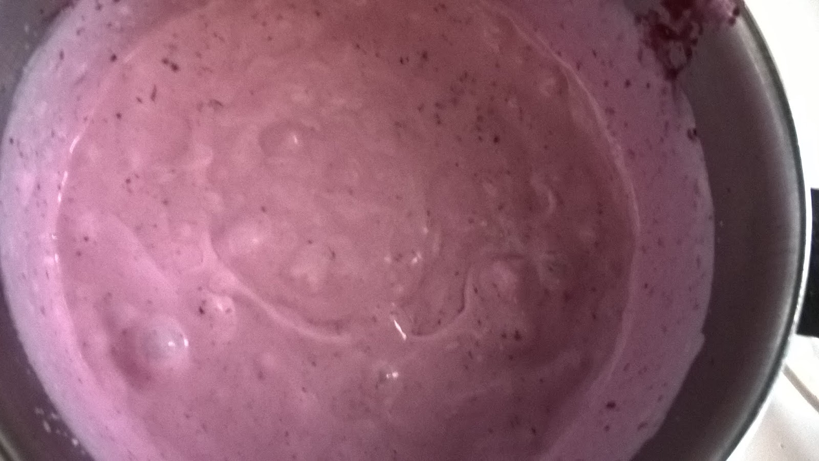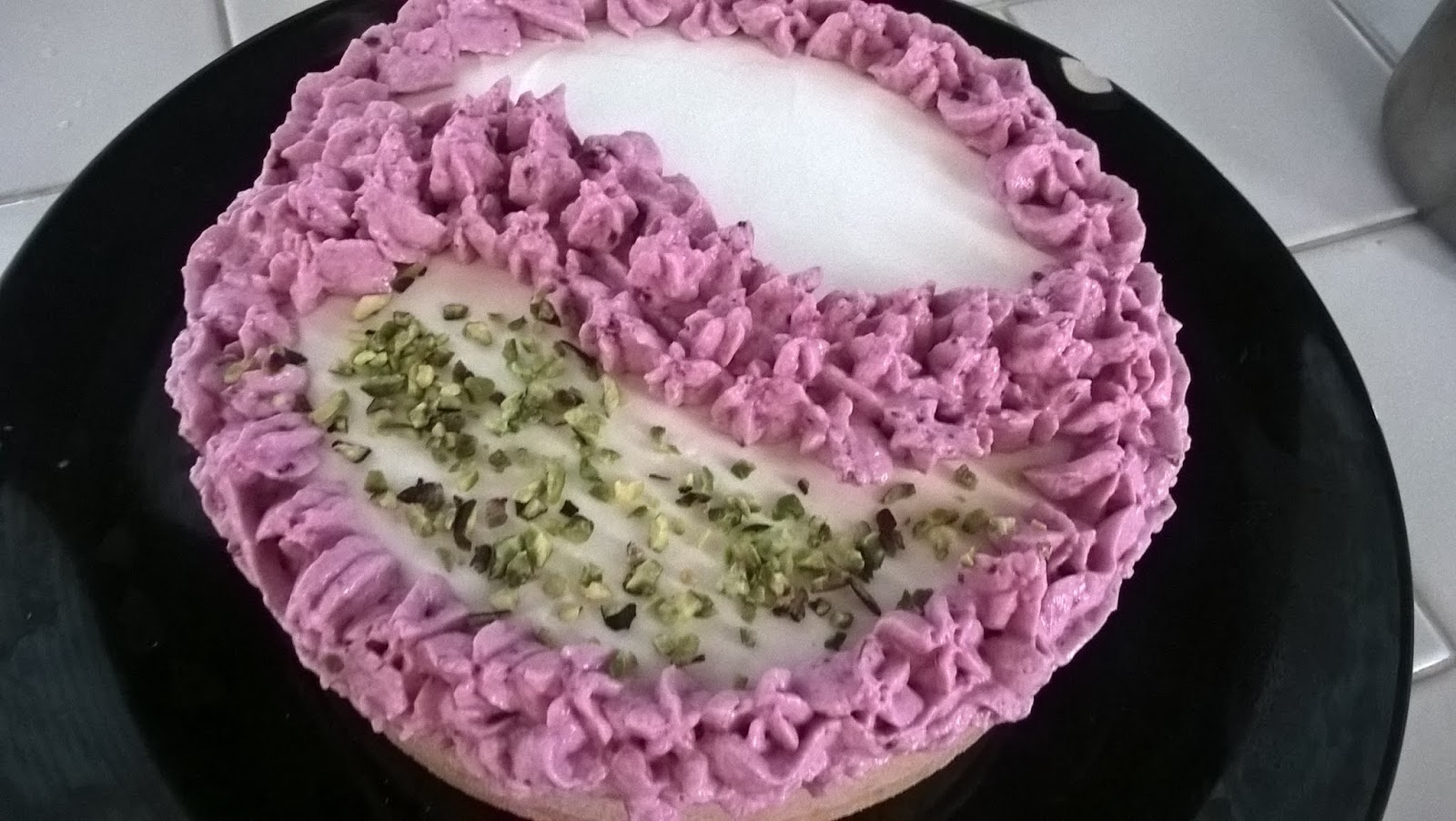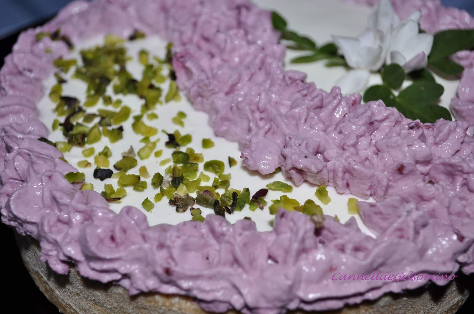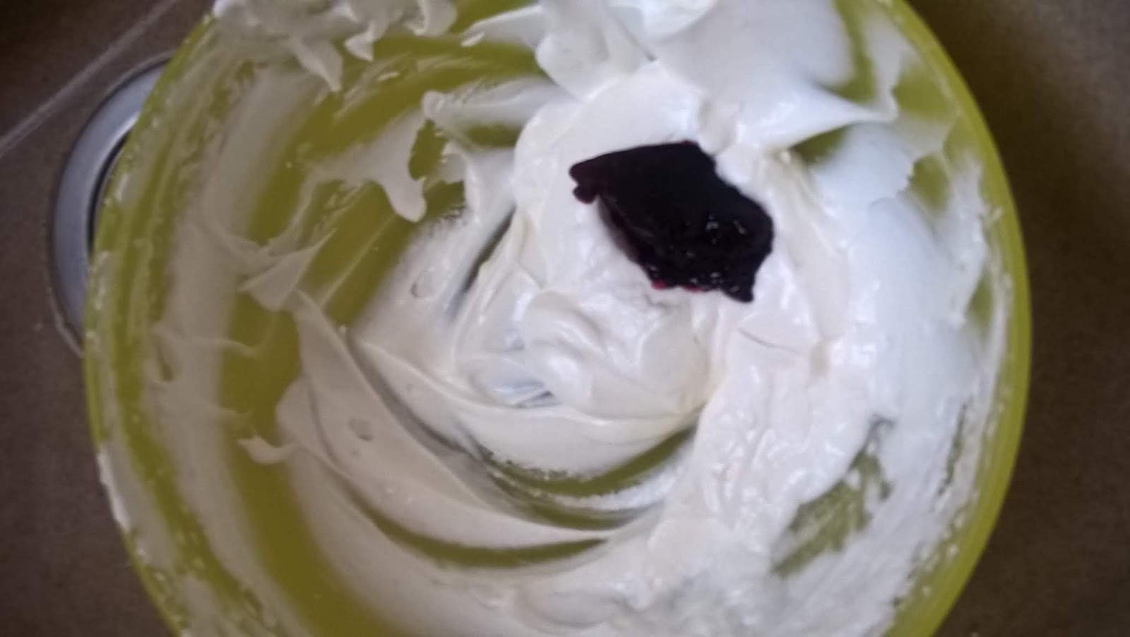 Unite alla restante panna un cucchiaio di composta e mescolate ottenendo una fantastica crema viola. Mettetela in un sac à poche e decorate la superficie della torta. Completate con qualche nota di verde per esaltare maggiormente i colori.