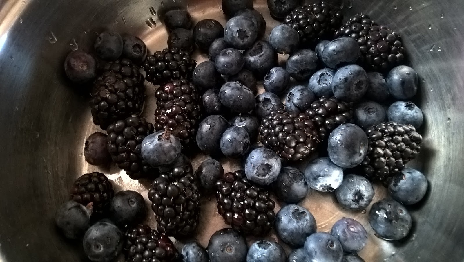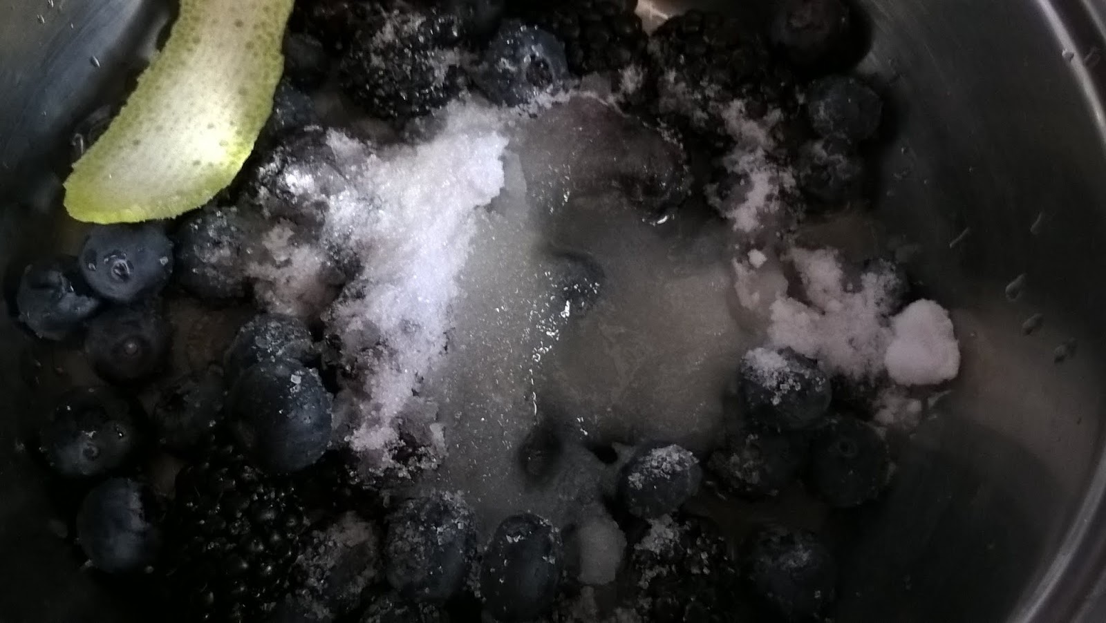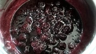 E adesso veniamo alla farcia: occorrono 300 g di frutti di bosco misti (io ho usato more e mirtilli), 200 g di zucchero, la buccia e il succo di mezzo limone. Mettete la frutta e lo zucchero insieme al succo e alla scorza del limone in una pentola e fate cuocere fino ad ottenere una composta (circa 20/30 minuti). Fate raffreddare.