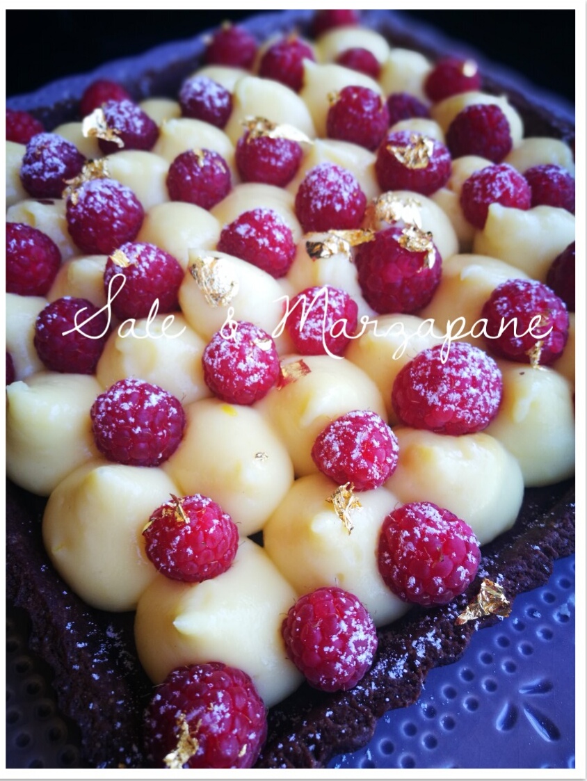 Ho decorato con lamponi freschi ed oro alimentare. Si abbinano a questa crema anche fragole fresche o altri frutti di bosco.
