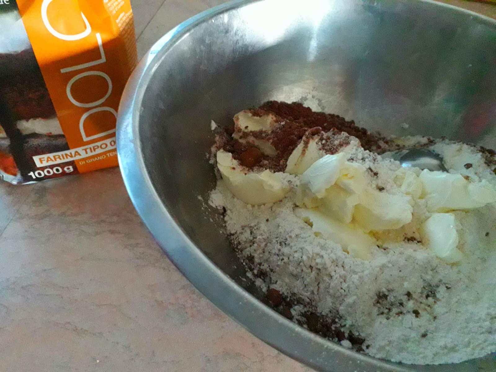 unire farina,cacao,burro,zucchero.nocciole e sale,mescolare il tutto poi unire le uova