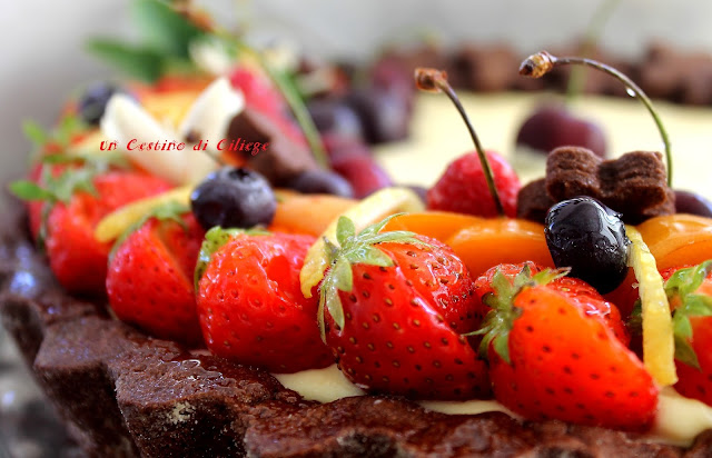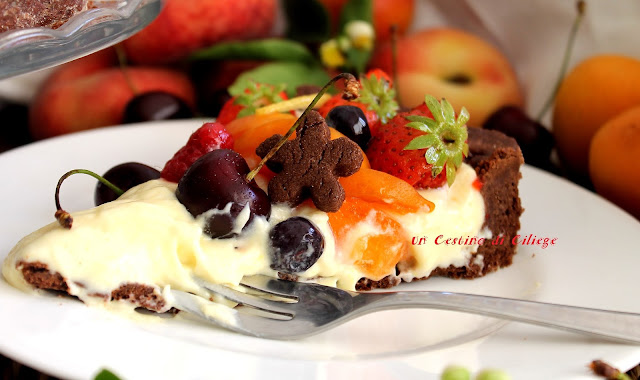 Posizionare il guscio di pasta frolla al cioccolato su un piatto da portata, farcire con la crema al mascarpone, decorare con frutta di stagione precedentemente lavata, asciugata e i biscotti.