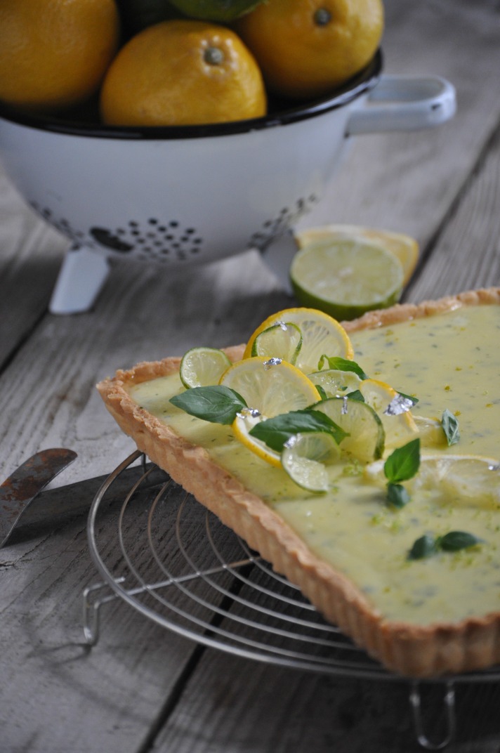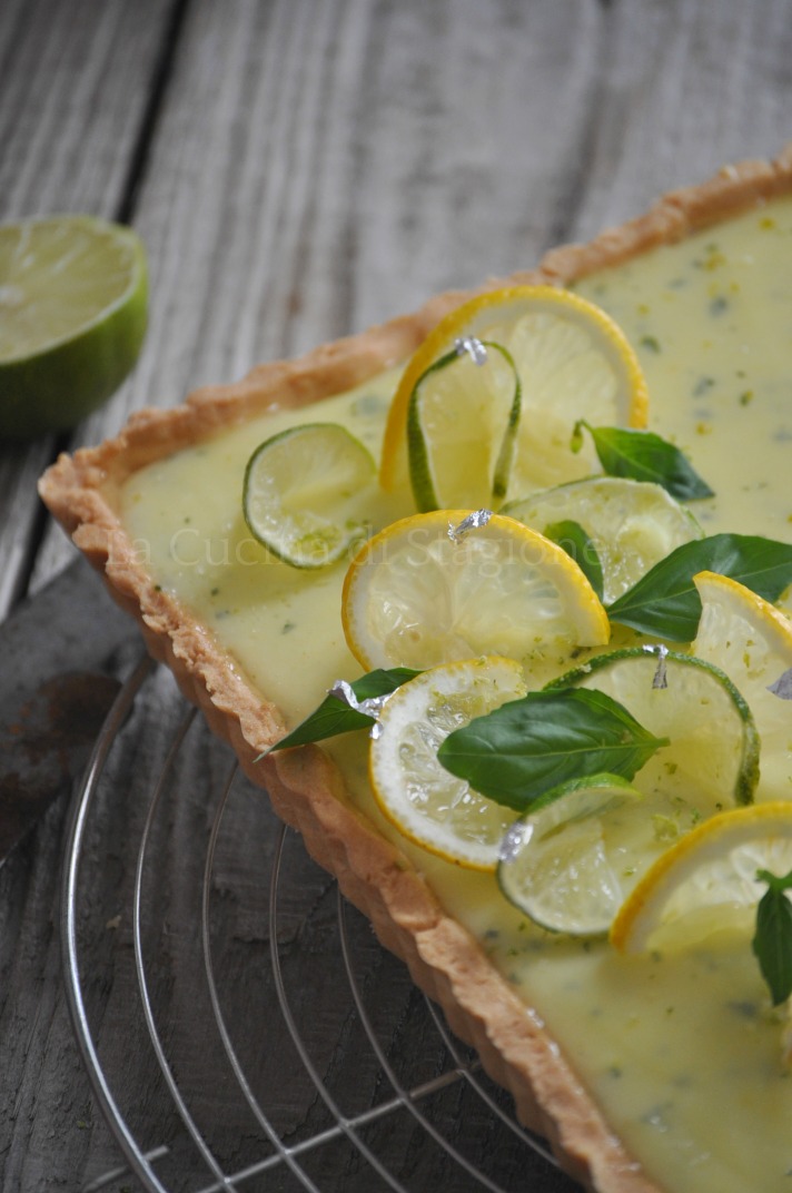 Per la frolla: montate il burro a pomata con lo zucchero a velo. Unite l’uovo leggermente sbattuto, amalgamendo senza incorporare aria. Unite la farina di mandorle e legate il tutto con 90 gr di farina per frolla. Terminate l’impasto con la restate farina (gr. 270) senza lavorare troppo. Appiattite la pasta, rivestitela di pellicola e riponetela in frigorifero per almeno 4 ore. Stendete la pasta frolla tra 2 fogli di carta da forno all’altezza di 3 mm. Rivestite una teglia, foratela (foto 1) e riponete in freezer per 40 minuti. Infornate a 160° per circa 25-30 minuti. Sfornate e lasciate raffreddare. Per la crema al limone e basilico: idratate la gelatina in acqua fredda. Tritate finemente le foglie di basilico ben lavate. Portate a bollore il succo di limone e lime. Nel frattempo montate le uova con lo zucchero. Unite a questo composto il succo caldo e poi versate il tutto nella casseruola. Portate a bollore a fuoco basso, mescolando. Appena la crema si sarà rappresa, togliete il tegame da fuoco, unite la gelatina strizzata e il burro a tocchetti freddo di frigorifero. Amalgamate con un frullatore a immersione. Aggiungete il basilico tritato. Versate la crema sul guscio di frolla ormai raffreddato, livellando con una spatola (foto 2). Riponete la torta in freezer per 1 ora. Per la glassa: reidratate la gelatina in acqua fredda. Portate la bollore l’acqua, il succo di limone e lo zucchero. Togliete dal fuoco. Unite la gelatina strizzata e la scorza di mezzo limone grattugiata. Spennellate abbondantemente la torta.