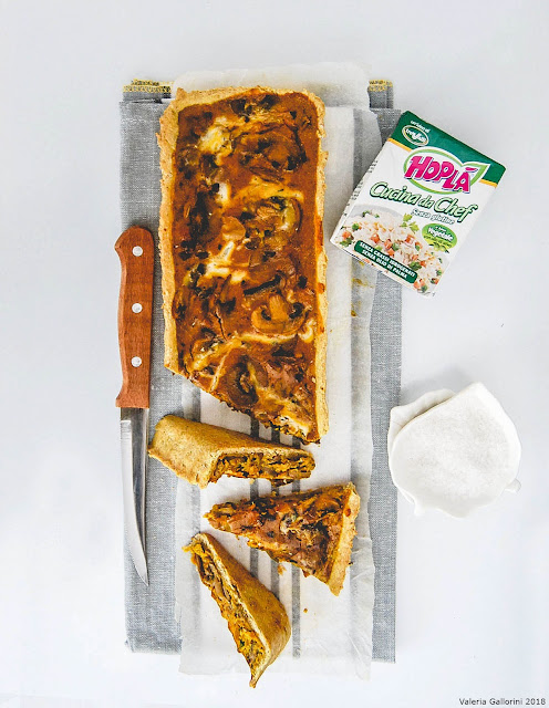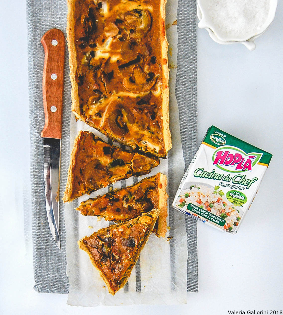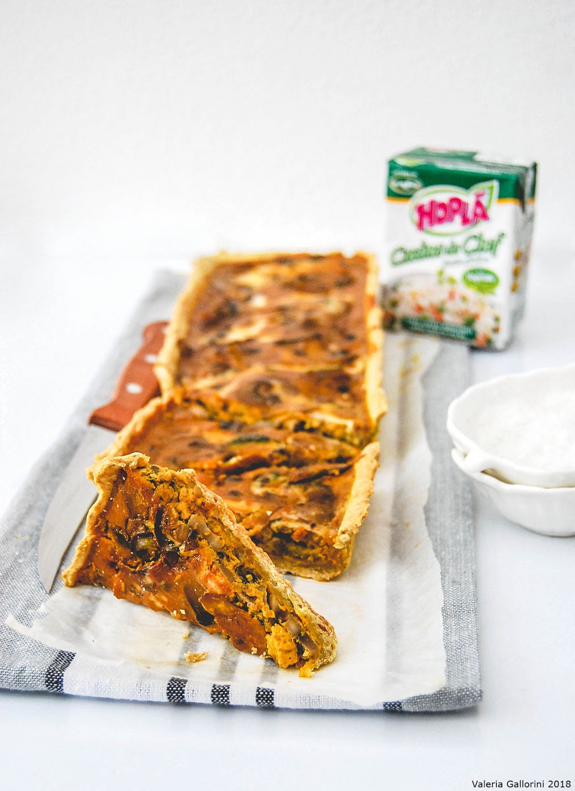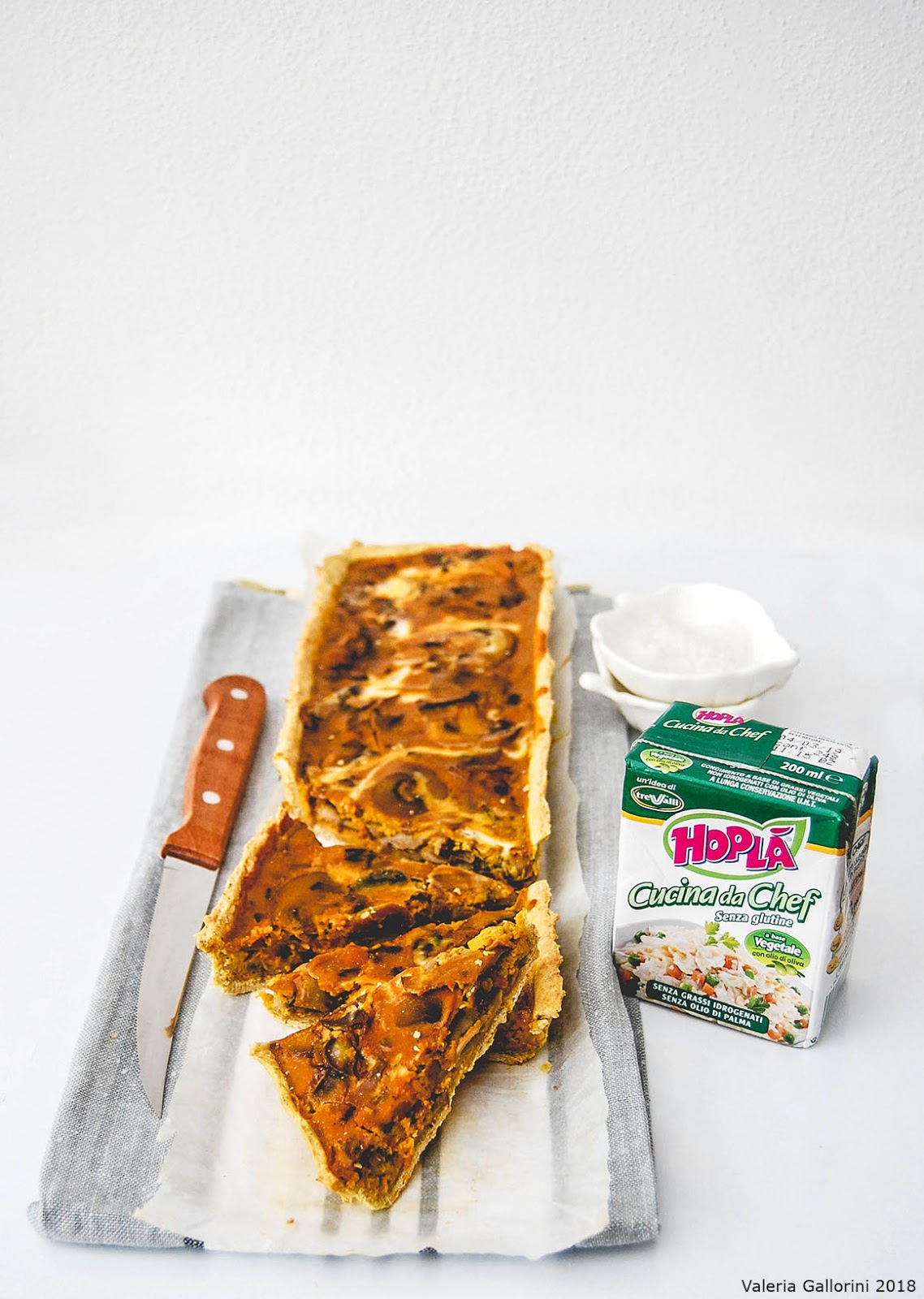 Un croccante guscio di leggera frolla all’olio e curcuma che racchiude un morbido e saporito ripieno di zucca, funghi e Hoplà Cucina da chef, il condimento a base vegetale con olio di oliva, senza grassi idrogenati e senza olio di palma.