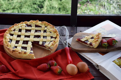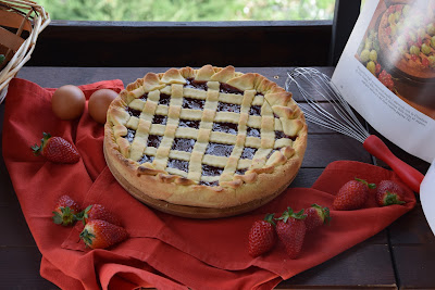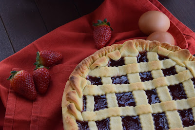 Stendete poco più di metà della pasta frolla ad uno spessore di 3-5 mm e con quanto avanza decorate a piacere la crostata dopo aver bucherellato il fondo con una forchetta e farcito con la marmellata di fragole (o quella che preferite).
