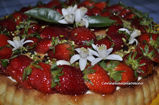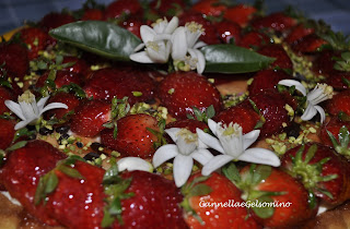 Sistemate le fragole sulla crema nel modo che più vi piace, completate con granella di pistacchio negli interstizi. Lucidate le fragole con la gelatina e per finire, decorate con zagare di agrumi, che profumeranno la vostra torta come non potete neanche immaginare.