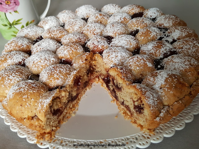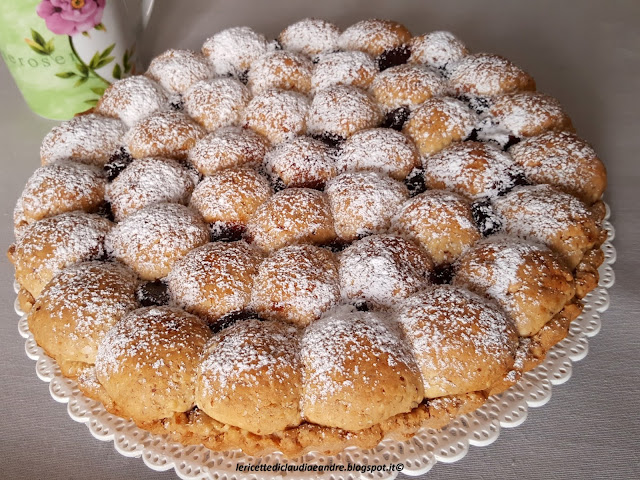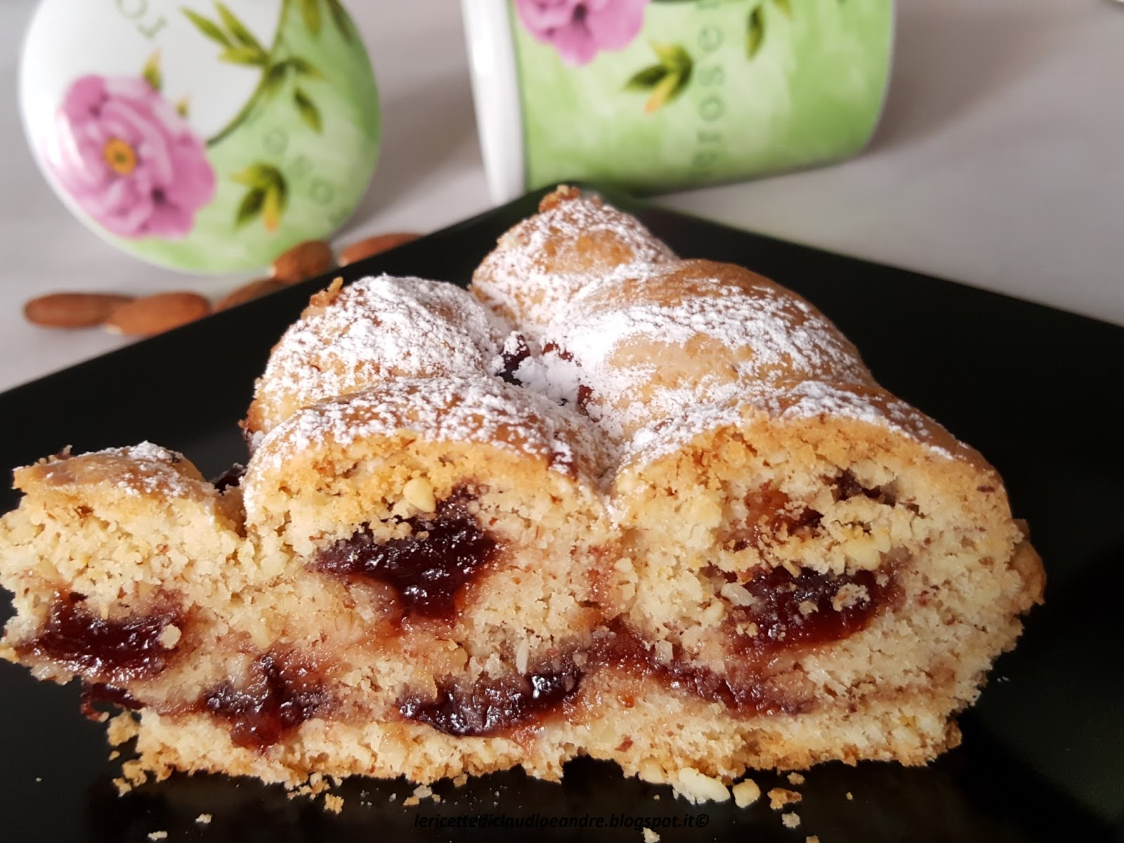 Questa torta crostata alle mandorle e doppia sorpresa con confettura e amaretti, l’ho vista alla prova del cuoco e siccome negli ingredienti ci sono anche le mandorle, non ho resistito e ho voluto provarla. Non avevo trovato la quantità dello zucchero, perciò ho messo una quantità a modo mio, usando dello zucchero a velo. Si possono riempire le palline anche con amarene sciroppate o altro a piacere. Ecco anche la mia versione con un ripieno di confettura di ciliegie, molto golosa !