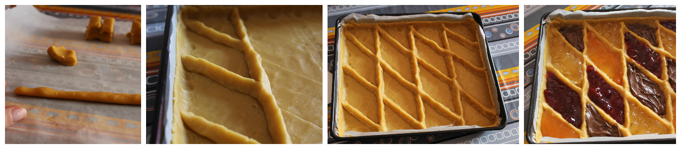 Riempite i rombi così creati con le marmellate e la crema di nocciola, fate in modo che ogni gusto sia ben alternato.