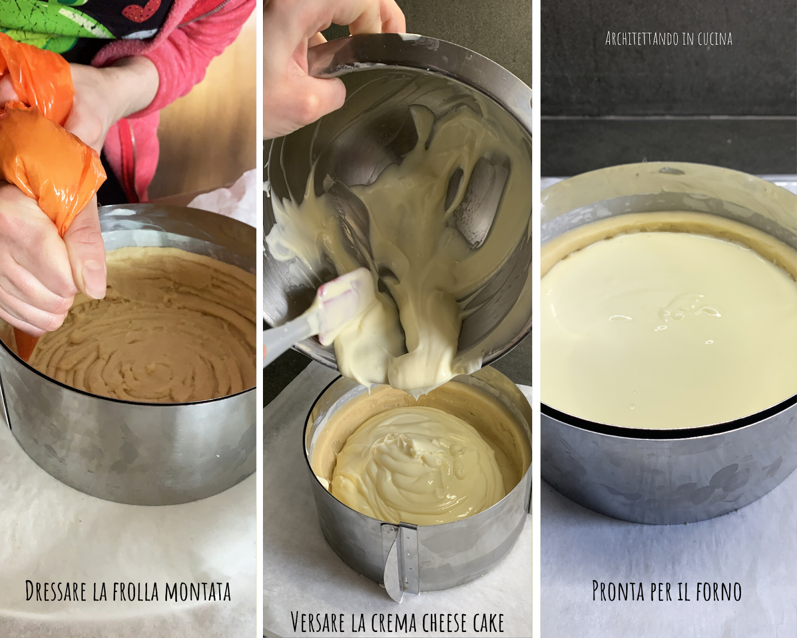 Lavorare in planetaria il formaggio con gli zuccheri, fino ad avere un composto spumoso. Aggiungere le uova sbattute e gli albumi, poche alla volta. Scaldare una piccola parte del composto e sciogliervi la gelatina, reidratata in acqua (l’avrà assorbita tutta) ed aggiungere tutto all’altra parte di composto.