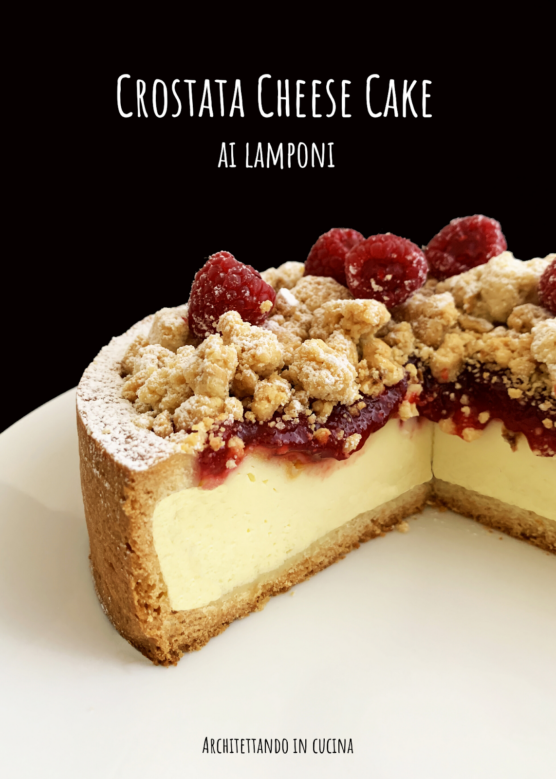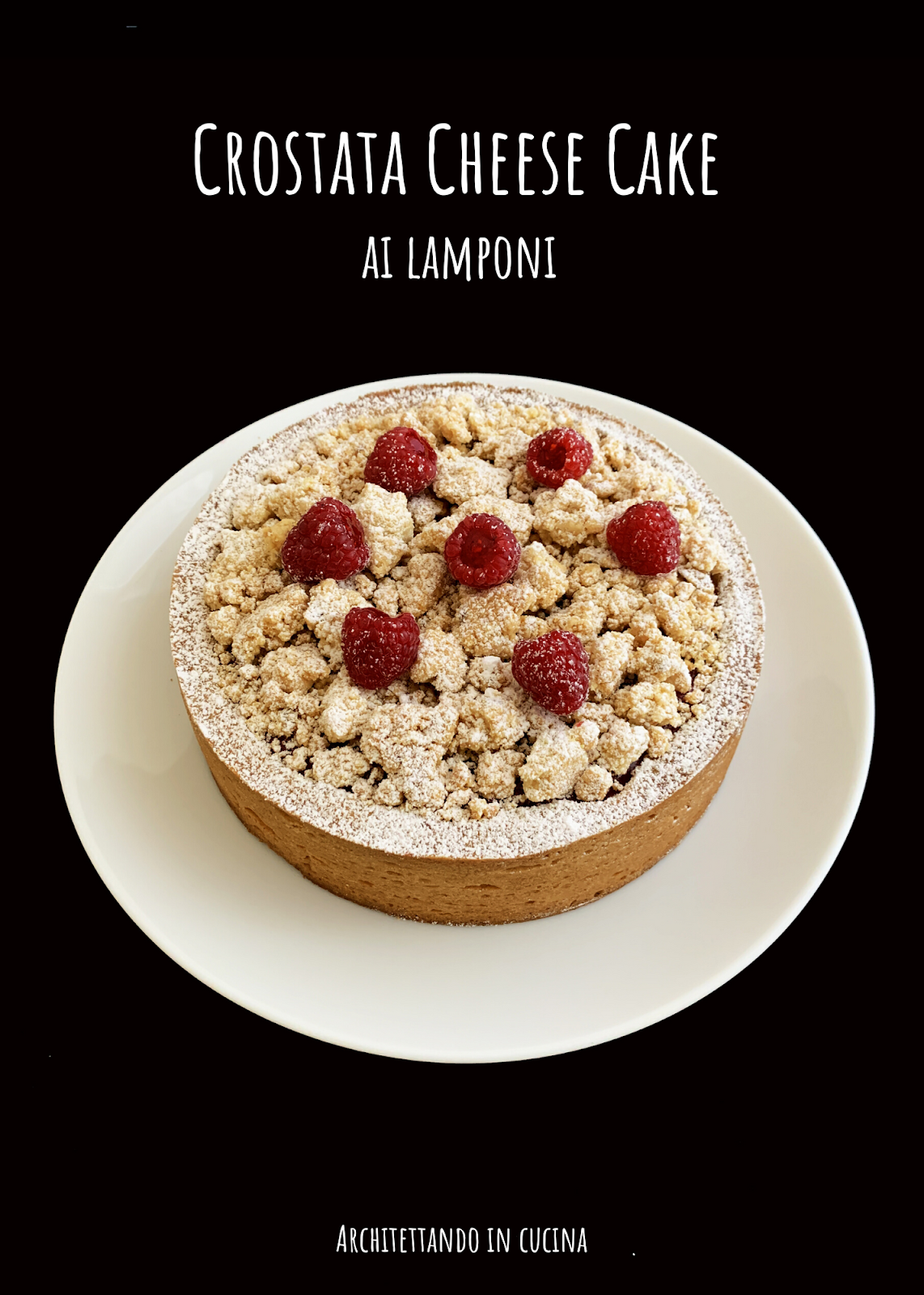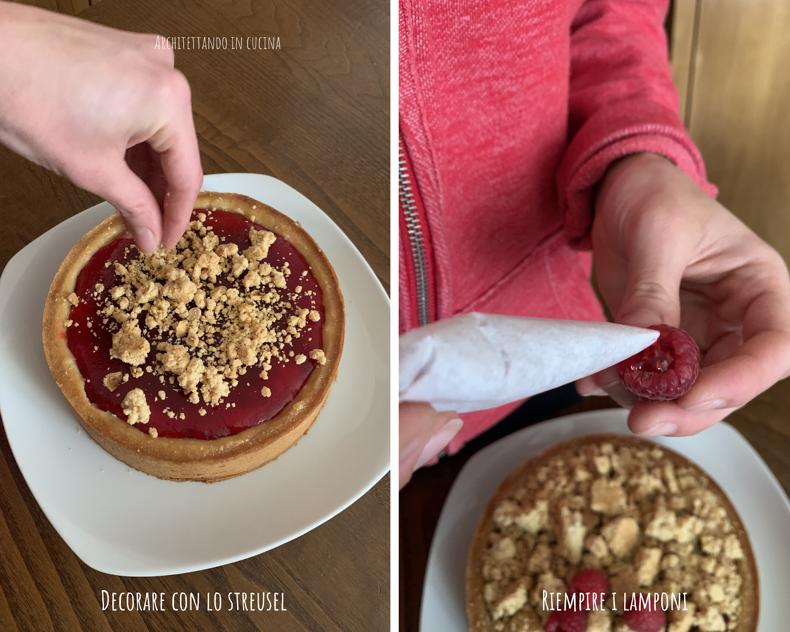 Stare sempre in casa per l’emergenza corona virus, mi fa passare tantissime ore in cucina. Adesso anche insieme a mia figlia che è tornata a casa, perché anche la sua, come tutte le scuole, è chiusa. Però insieme facciamo davvero un sacco di cose buone da mangiare: come questa torta del maestro Stefano Laghi. In realtà lei fa la pasticciera e io faccio le foto, scrivo e anche imparo un sacco di cose. La crostata cheese cake mi ha intrigata subito. Una cheese cake cotta dentro un guscio di frolla montata, gelatina di lamponi, un disco dacquoise, una cascata di streusel e per finire lamponi ripieni di gelatina.