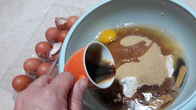 In una ciotola mettete tutti gli ingredienti, la farina, lo zucchero, l’olio, le uova, il caffè.