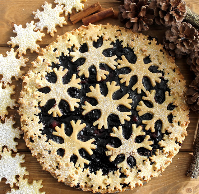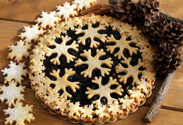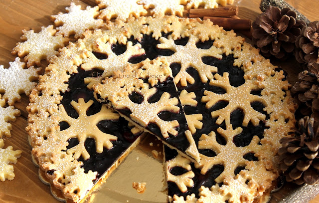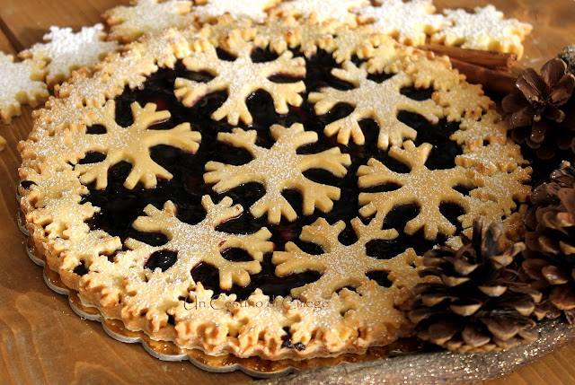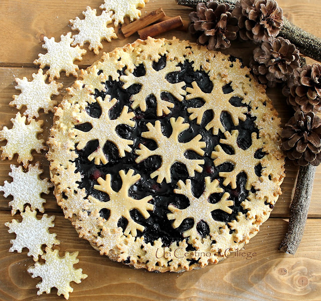 Oggi decorata con tanti fiocchi di neve in pasta frolla che la rendono elegante e in tema natalizio.