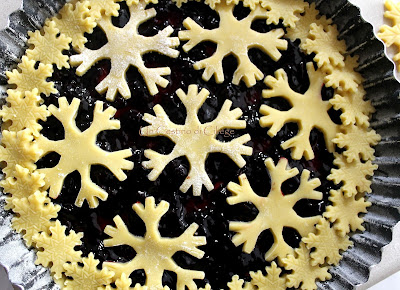 Imburrare e infarinare uno stampo per crostate del diametro di 24 cm, rivestirlo con la pasta frolla, farcire con la confettura e decorare con i fiocchi di neve tagliati con l ‘apposito stampino.