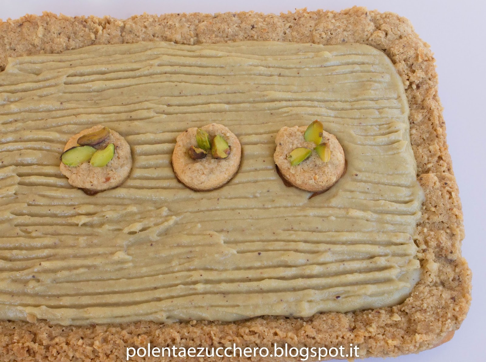 Nella parte centrale della pasta frolla versare la crema ai pistacchi preparata e decorare il centro con i biscottini ai pistacchi.