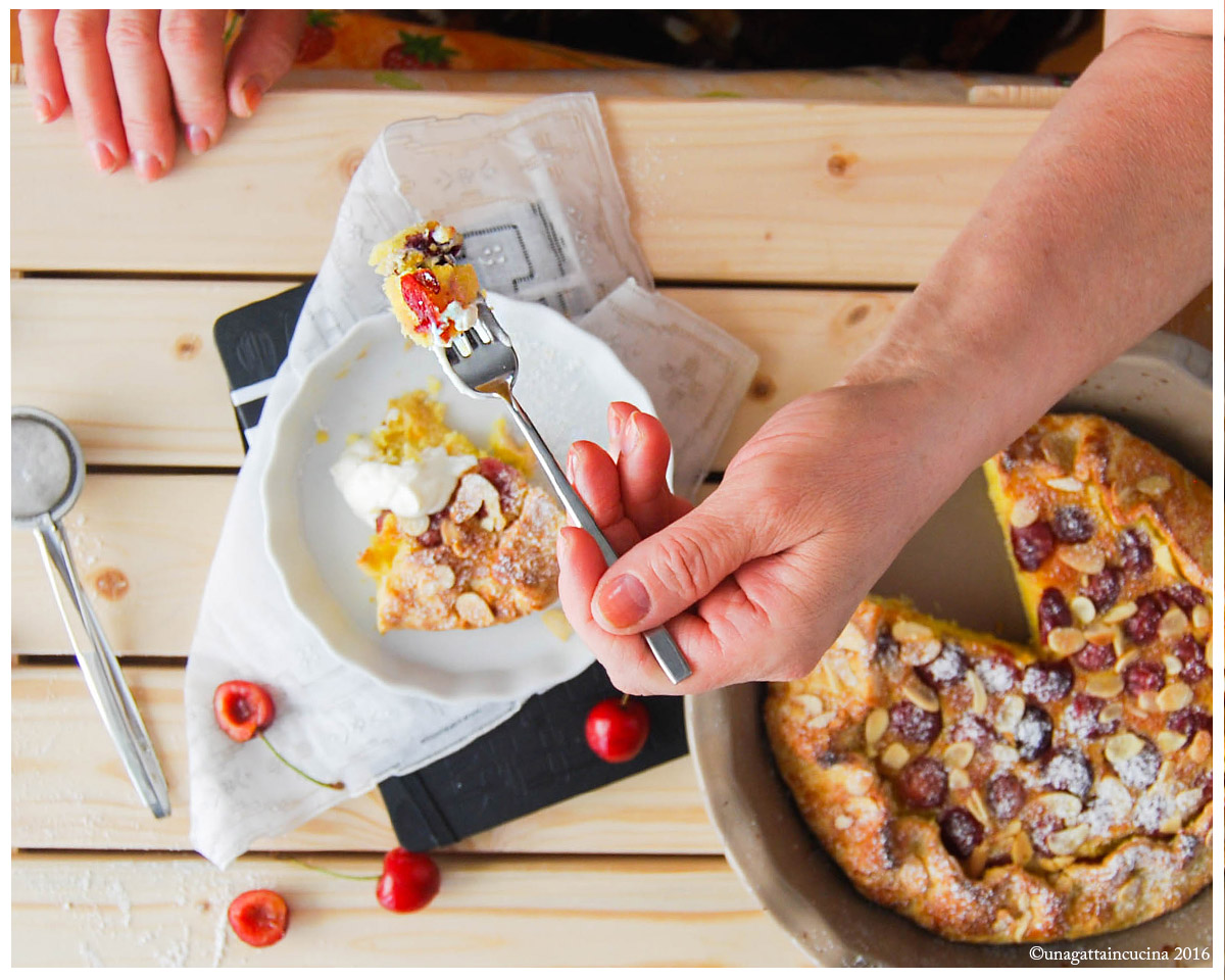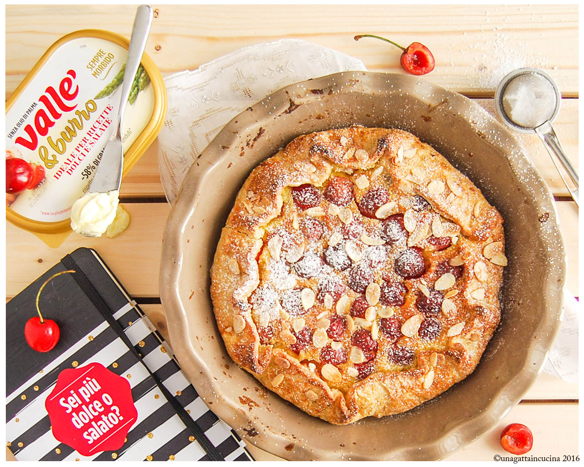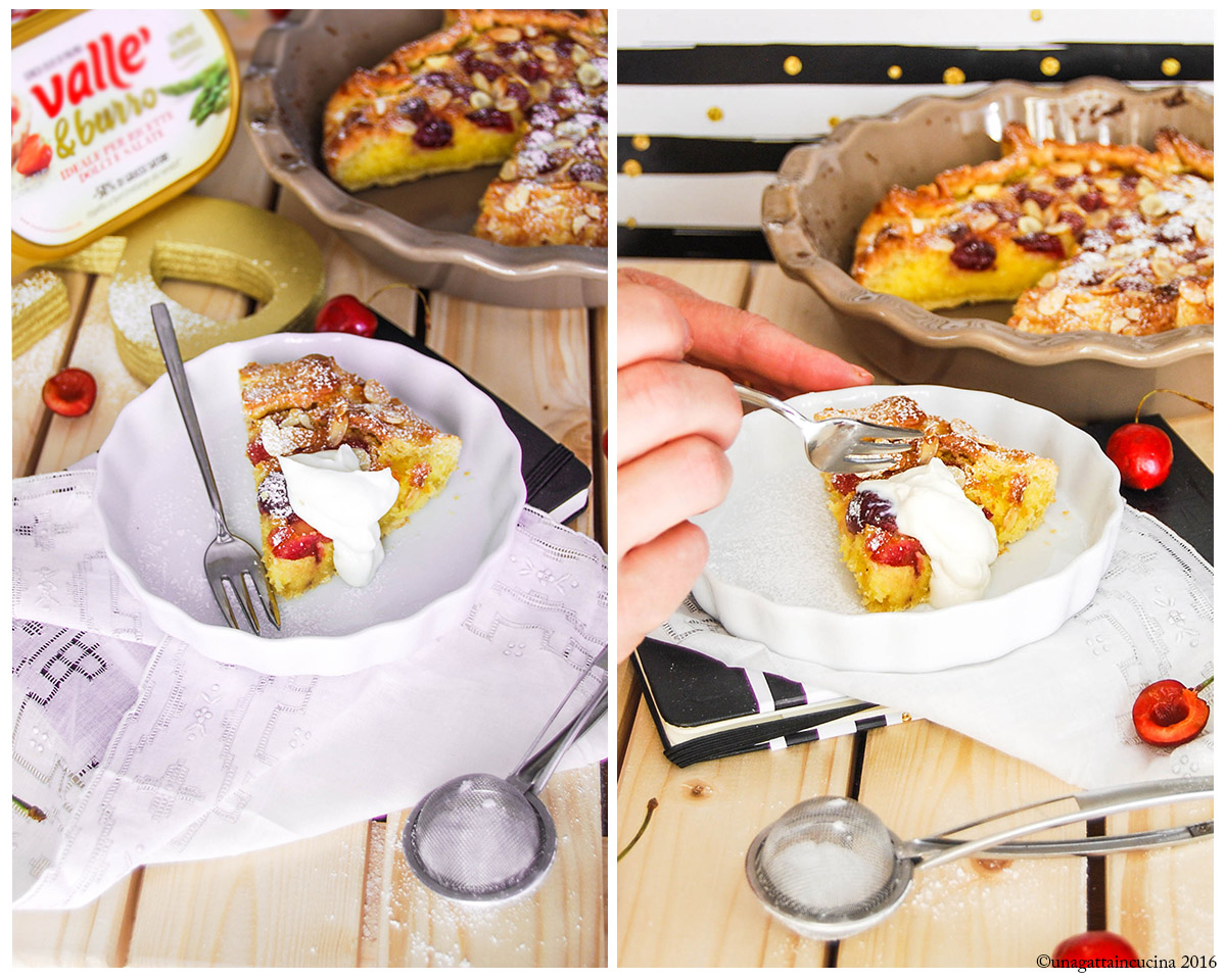 Quindi, ecco qua la mia proposta dolce: un guscio pasta brisée che racchiude una morbida e profumata crema frangipane al cocco con ciliegie e croccanti mandorle.