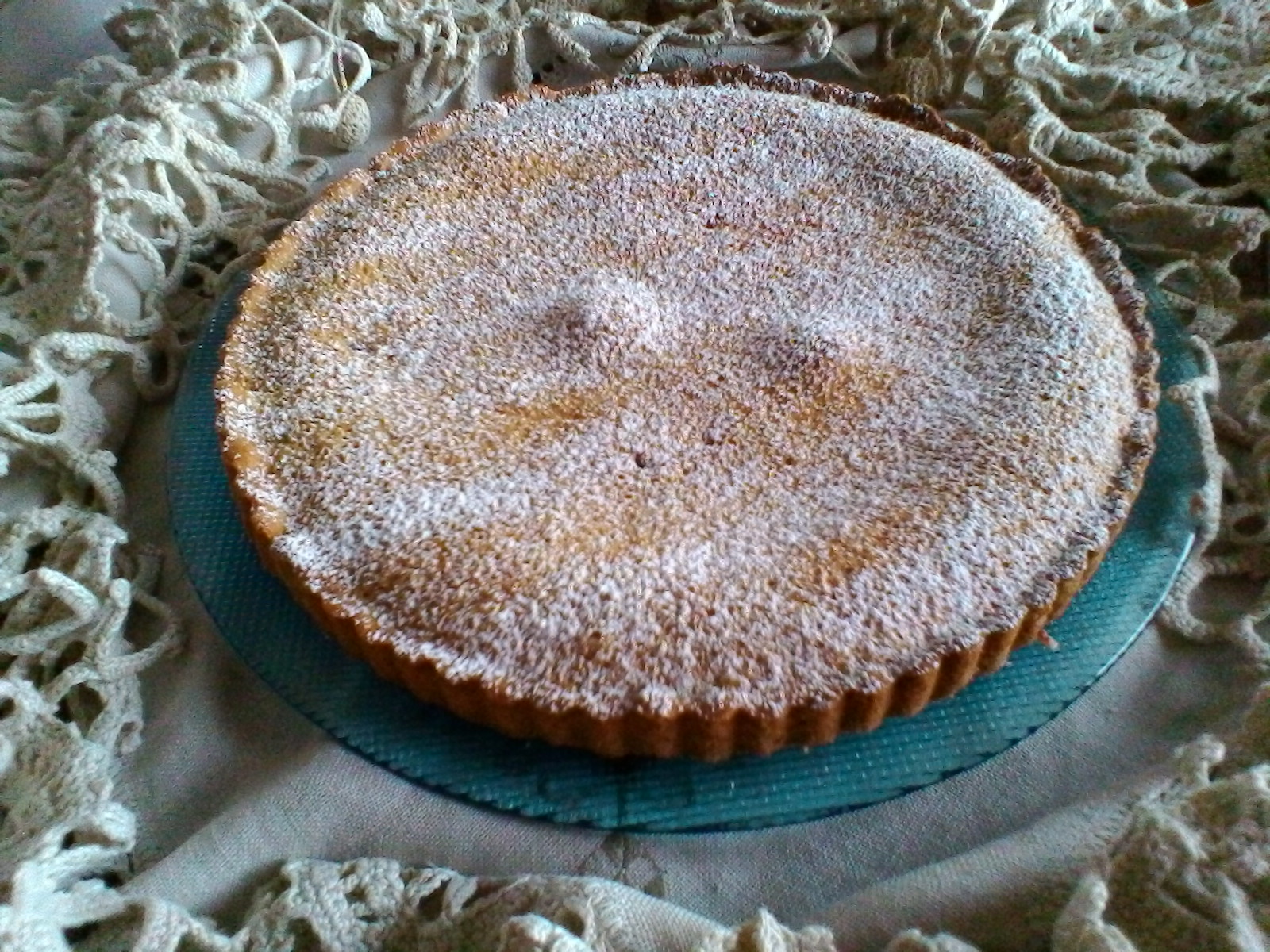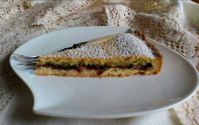 Ma che cos’è il frangipane? E’ una crema di mandorle, burro, zucchero e uova che si cuoce in forno insieme alla frolla e che assume una consistenza tra un soffice pan di spagna e una crema. La versione francese prevede anche la crema pasticcera che io logicamente ho saltato desiderando una crema più leggera. La crostata mi è piaciuta subito al primo assaggio: la consistenza è favolosa, la friabilità della frolla lascia spazio alla morbidezza e al profumo della crema e arriva infine lo strato vellutato della marmellata a completare il tutto. Non ci sono dubbi: mi ha proprio conquistato!