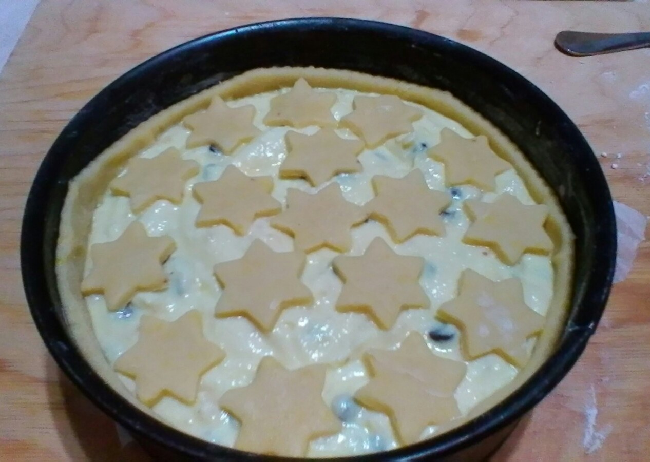 Stendete la frolla in una tortiera a cerniera dai bordi alti ( cm 24 ), versate la farcia di ricotta e decorate con stelline di frolla.