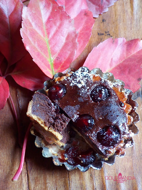 170 g di cacao amaro in polvere, 30 g di fecola, 130 g di albume, 20 gr. di amarene sciroppate: unisci le polveri setacciate poco per volta e girando delicatamente con una spatola; monta l’albume a neve ferma e incorpora poco per volta al composto, cercando di non smontarlo. Riempi i gusci di frolla precedentemente cotti e aggiungi le amarene, inserendole sulla superficie. Metti in forno a 170 °C per 5 minuti o comunque il tempo strettamente necessario affinché il ripieno si gonfi e si asciughi in superficie, rimanendo morbido all’interno.