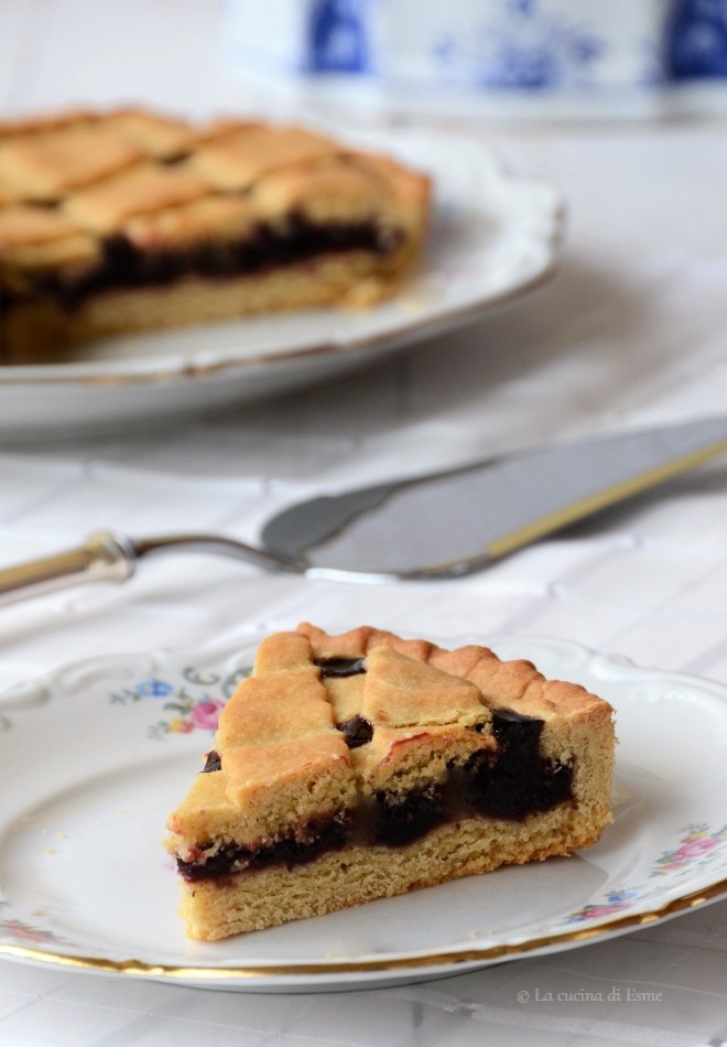 Assemblaggio e cottura – Stendete la pasta frolla ad uno spessore di circa 4 mm e adagiatela nello stampo per crostata precedentemente oliato (io uso quelli con fondo amovibile e olio solo il bordo, mentre il fondo lo rivesto con carta forno). Fate in modo che la frolla aderisca perfettamente alle pareti dello stampo e bucherellate il fondo con i rebbi di una forchetta. Farcite con uno strato abbondante di confettura, livellandola con il dorso di un cucchiaio. Stendete la restante frolla per ricavarne delle strisce con cui guarnirete la superfice della vostra crostata. Mettete in frigo la crostata a riposare mentre il forno raggiunge la temperatura. Cuocere in forno preriscaldato a 180° statico per 35-40 minuti. Io sono solita cuocere le crostate una tacca più in basso della metà del forno. Si conserva perfettamente per vari giorni sotto la classica campana di vetro. Buon appetito!