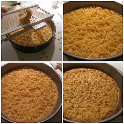 - con l’aiuto di una grattugia a fori larghi grattugiate ora la frolla sulla farcia di ricotta in modo da ottenere una frolla “grattugiata” che andrà a ricoprire in maniera uniforme il ripieno della vostra crostata