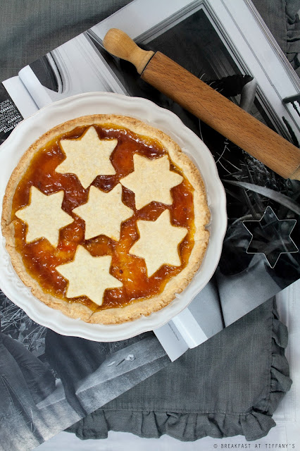 Place the dough into the round cake tin and prick with a fork the bottom; spread the apricot jam evenly and shape stars with the remaining ball dough and with a cookie cutter.
