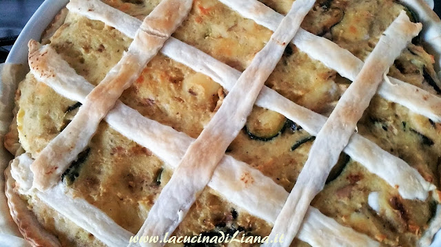 Ritagliare dal rotolo di pasta delle strisce da utilizzare come losanghe. Stendere la pasta su una teglia rivestita di carta forno, bucherellare la superficie con una forchetta, e distribuire il ripieno di verdure in maniera uniforme, versare sopra il composto di uova e formaggio. Disporre le losanghe decorative e infornare a 180° per 20 minuti.