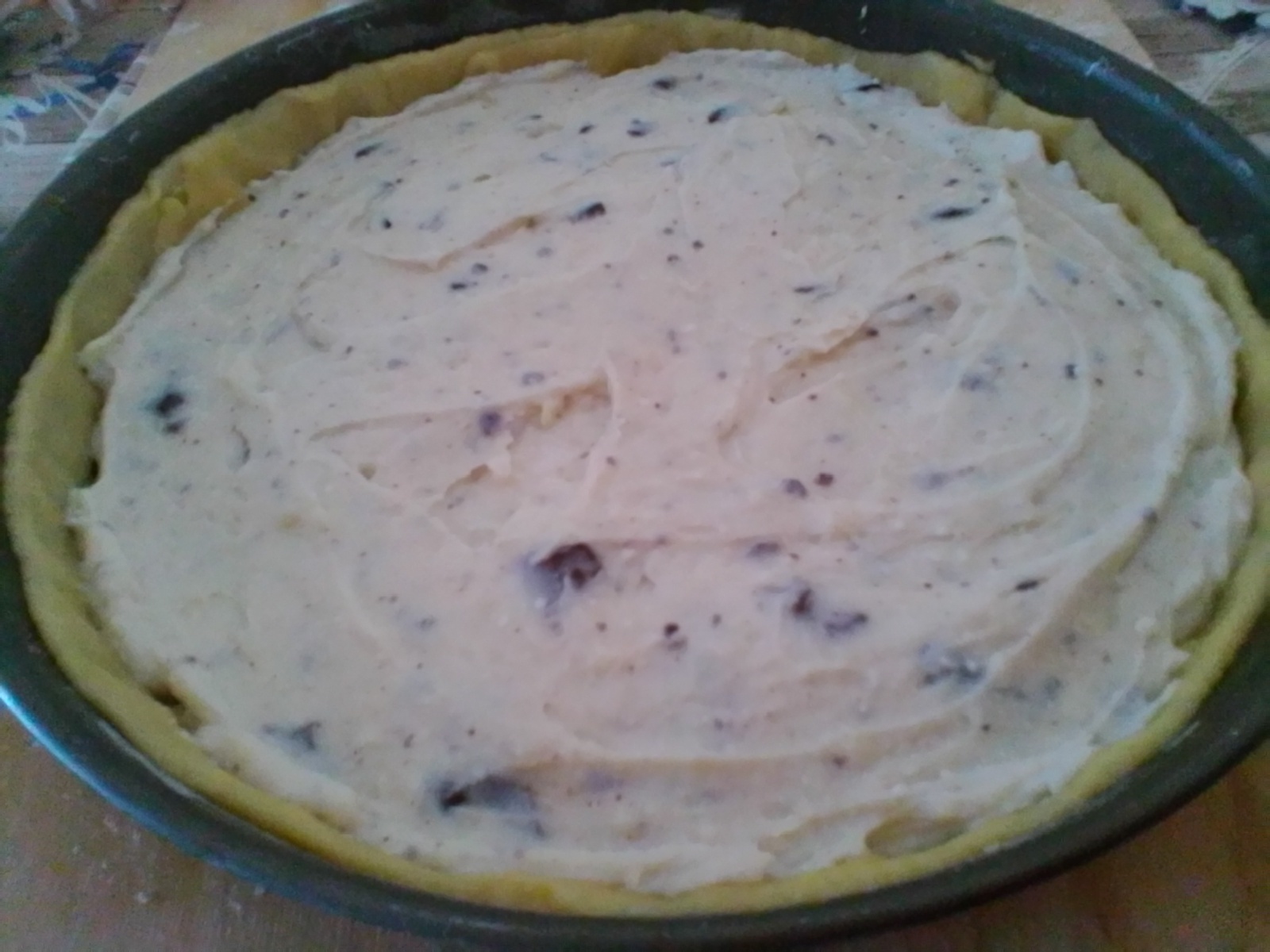 Prendete adesso la frolla e foderate con i 3/4 fondo e lati di una tortiera imburrata e infarinata. Coprite il fondo con gli amaretti sbriciolati e del cioccolato fondente fatto sciogliere con un pò di latte, di seguito versate la crema.